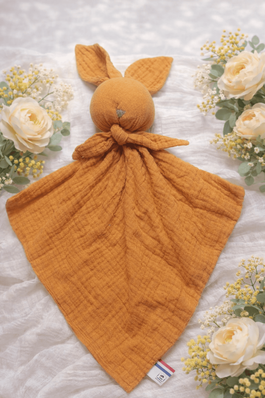 Fait en double gaze de coton safran. La tête est rembourrée avec de la ouate hypoallergénique.