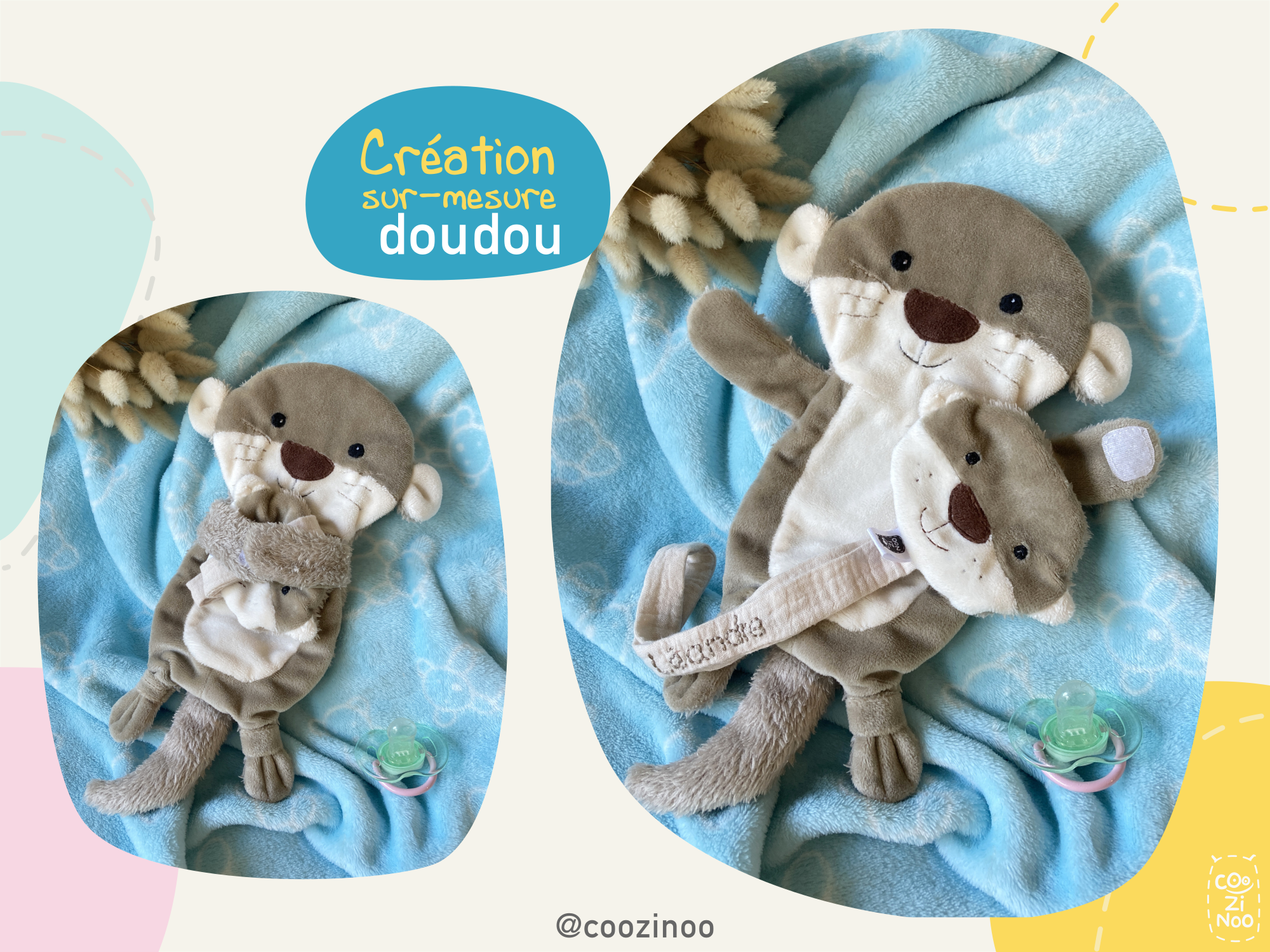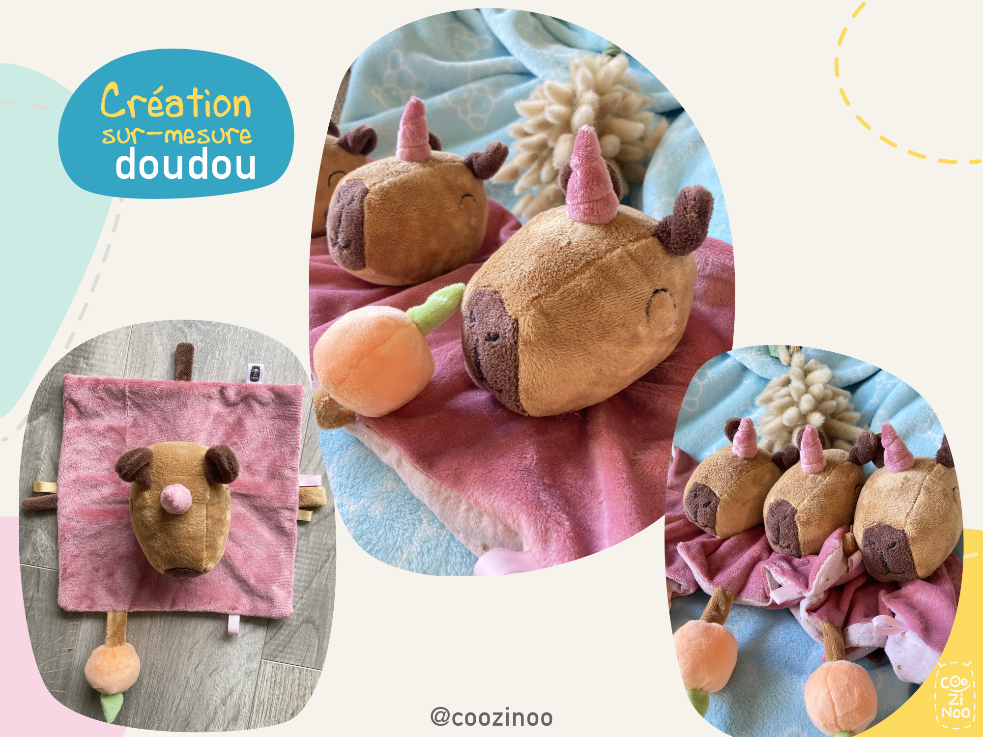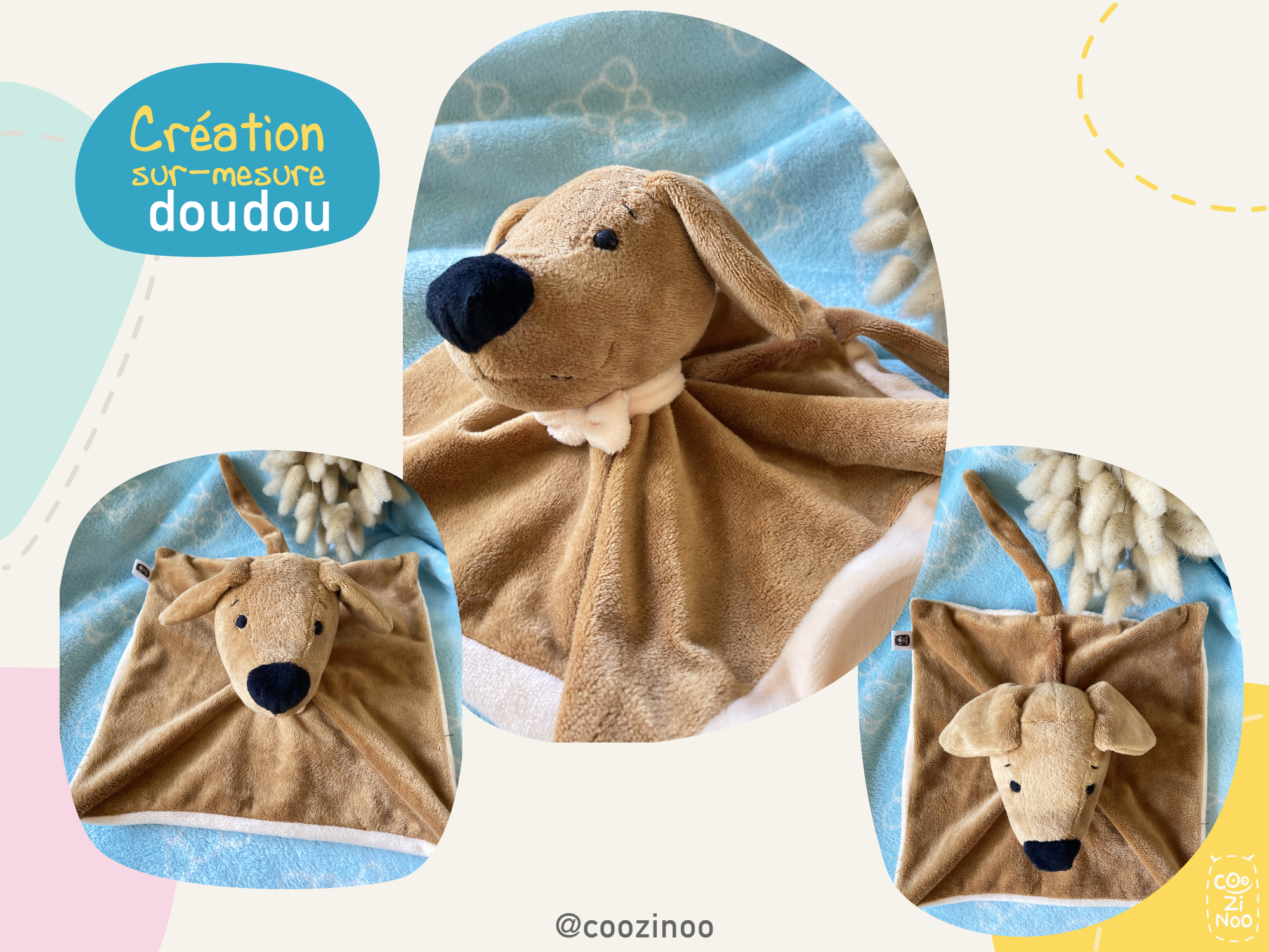 Vous souhaitez un “doudou tout plat” à l’effigie d’un animal (ou autre) tout en gardant ma patte créative ? Vous voulez me laisser carte blanche dans la conception du doudou ? Pas de panique, ma créativité et mon imagination sont là pour vous proposer un doudou unique avec une bouille de Coozinoo si particulière et attachante ! N’hésitez pas à jeter un oeil à la fiche produit “Doudou plat sur-mesure“.