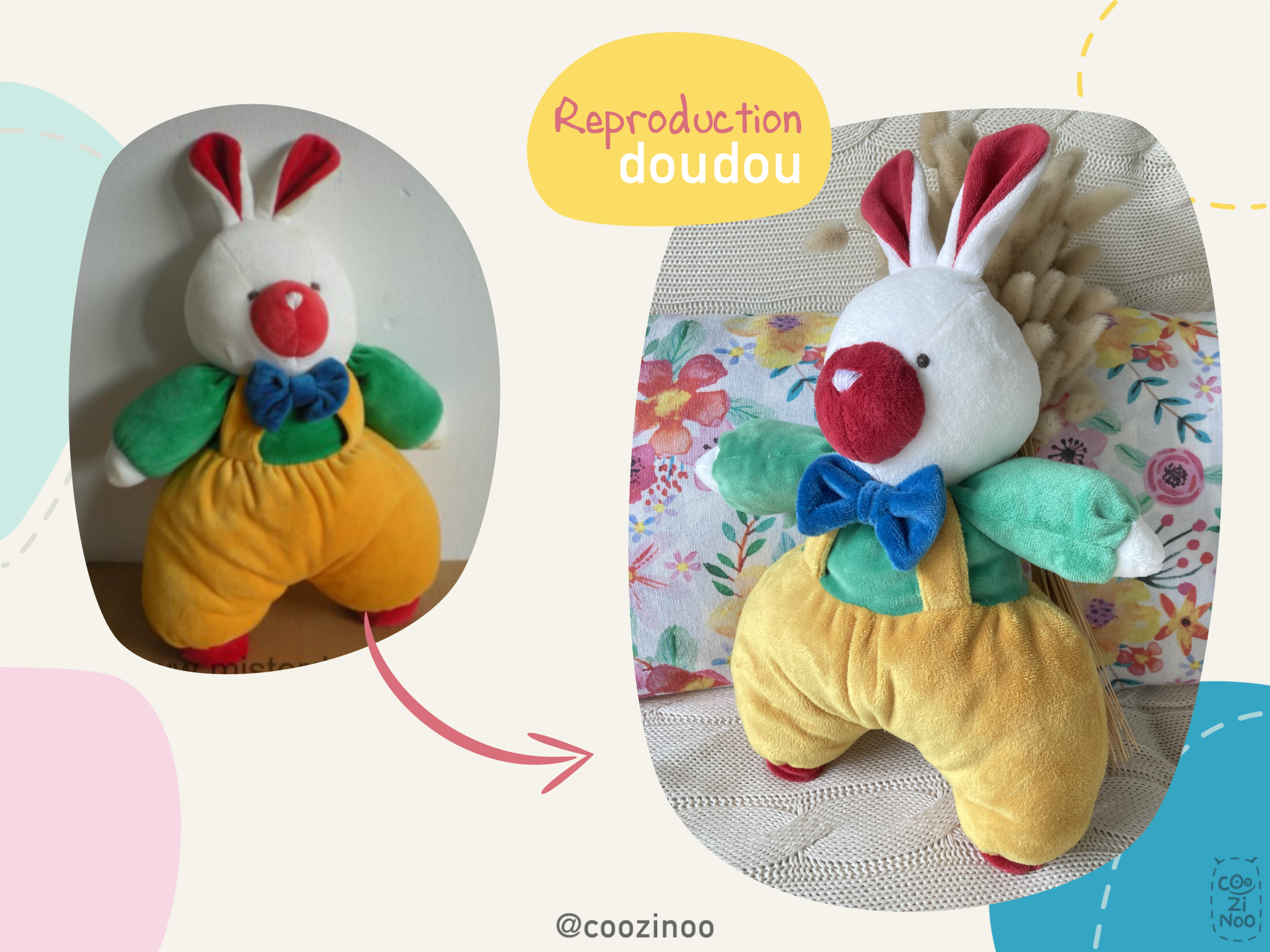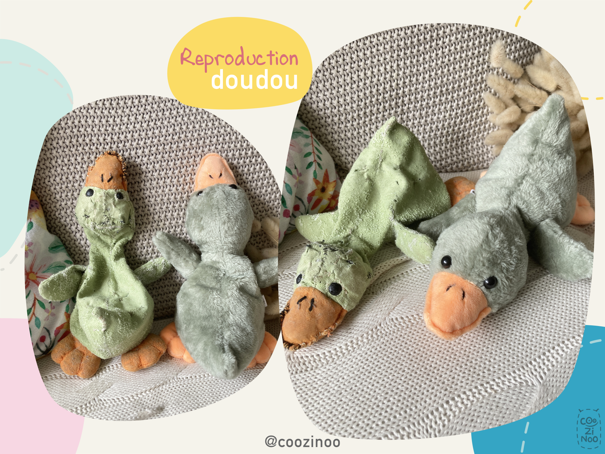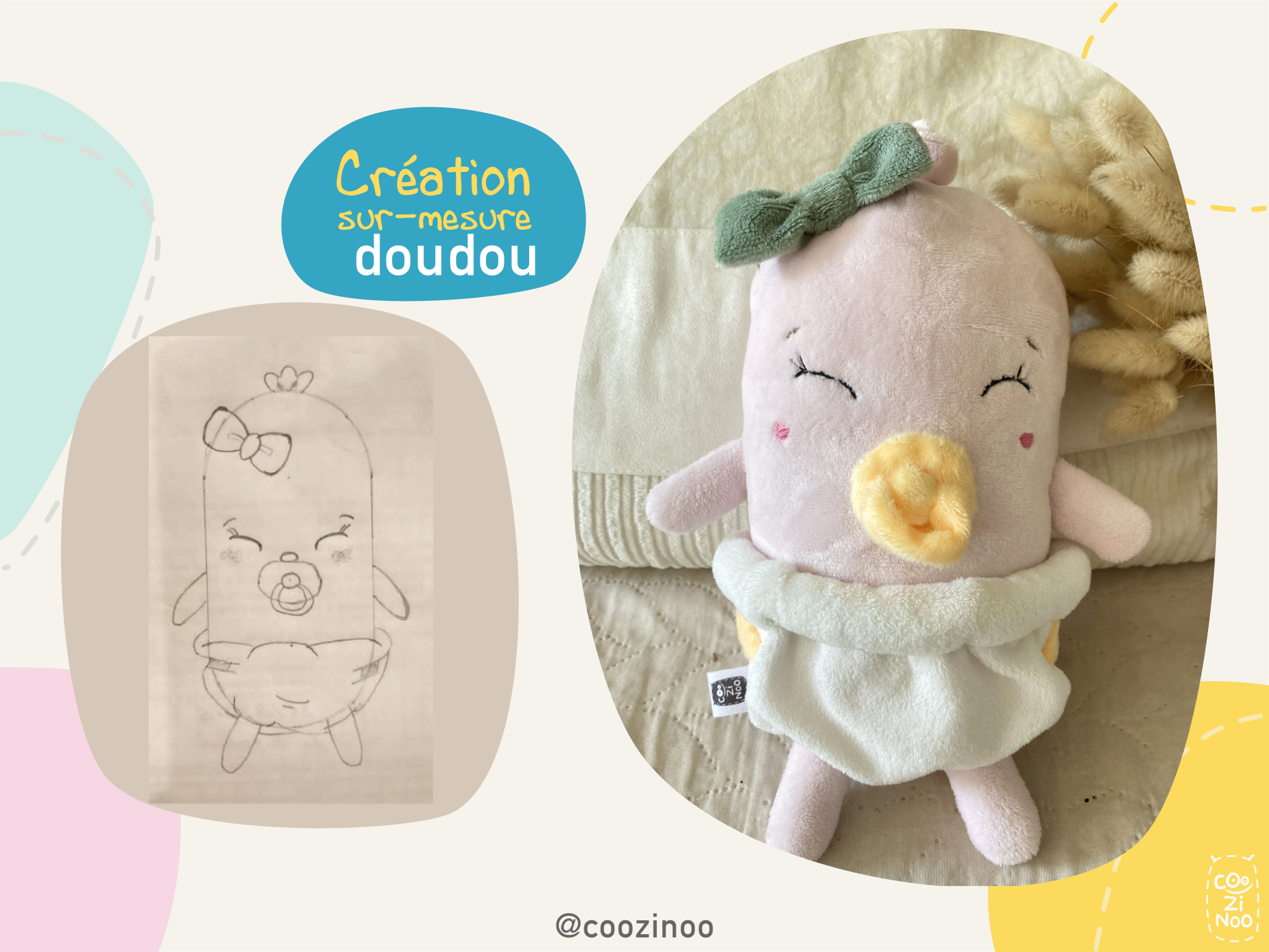Chaque doudou Coozinoo est entièrement dessiné, cousu et fabriqué à la main, avec amour ♡, en France.