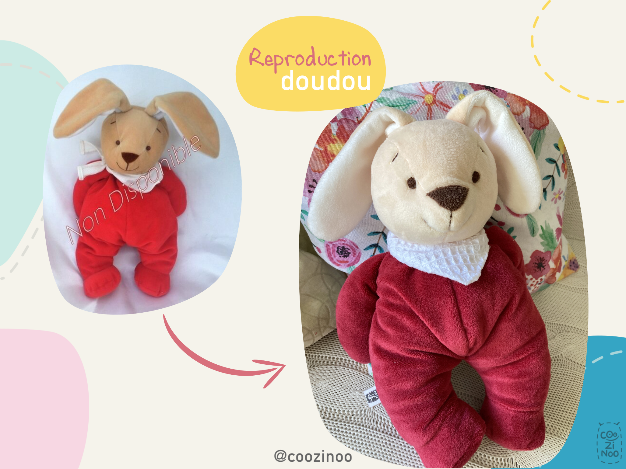 Vous ne retrouverez plus le modèle de votre doudou en magasin ? Le doudou de votre enfant est trop ancien et n’existe plus nul part ? Vous aimeriez redonner vie au doudou de votre enfance ? En me fournissant des photo et un descriptif détaillé, je recrée votre doudou au plus proche du modèle d’origine * . N’hésitez pas à me raconter son histoire et ses petits détails que votre enfant adore, afin que la reproduction soit la plus fidèle possible.