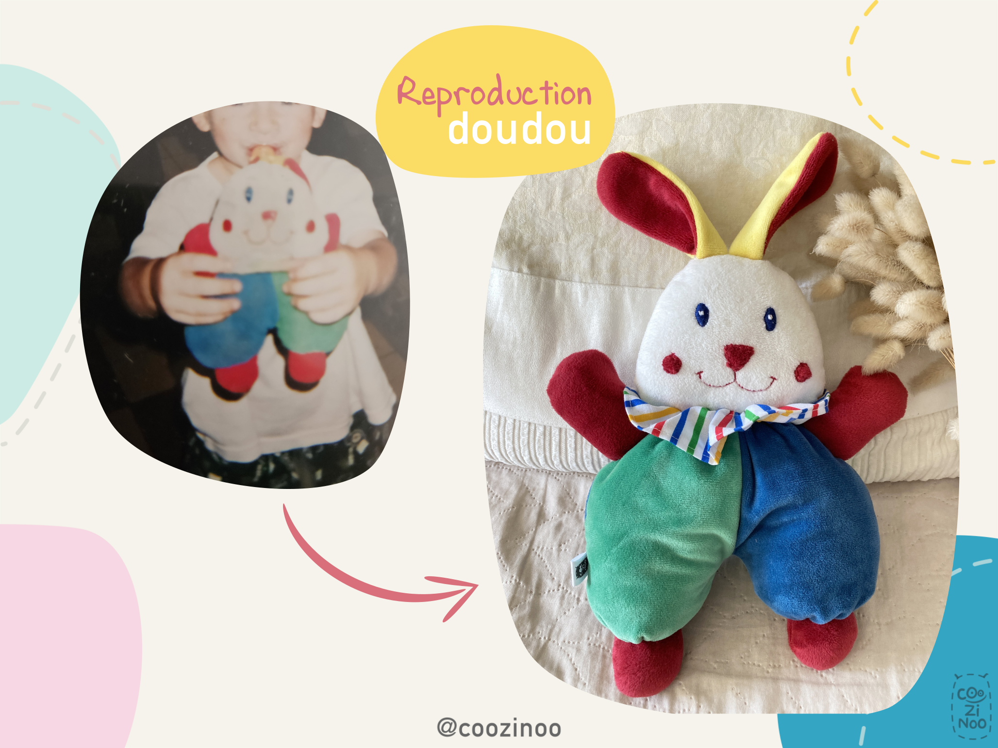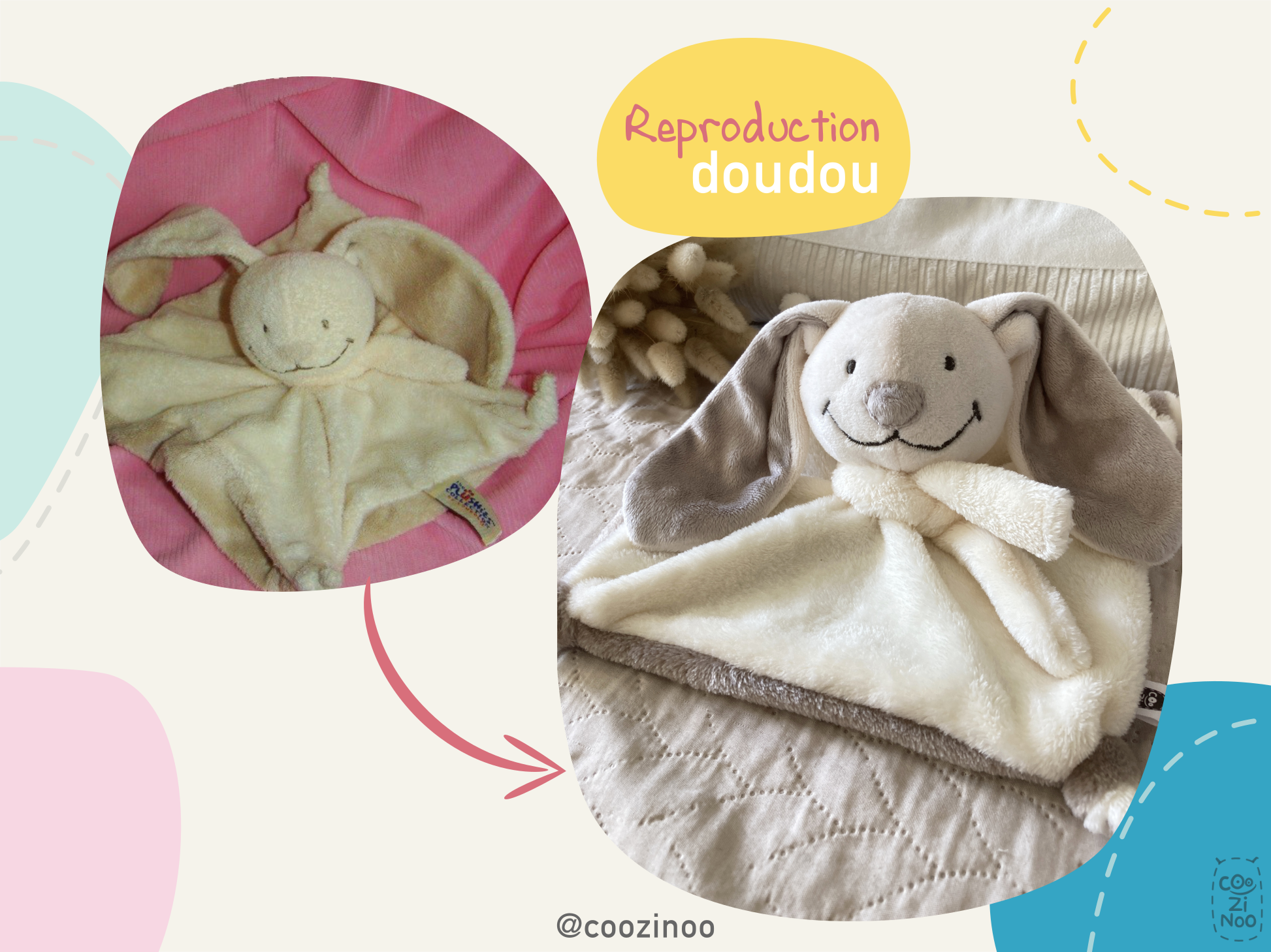 Vous ne retrouverez plus le modèle de votre doudou en magasin ? Le doudou de votre enfant est trop ancien et n’existe plus nul part ? Vous aimeriez redonner vie au doudou de votre enfance ? En me fournissant des photo et un descriptif détaillé, je recrée votre doudou au plus proche du modèle d’origine * . N’hésitez pas à me raconter son histoire et ses petits détails que votre enfant adore, afin que la reproduction soit la plus fidèle possible.