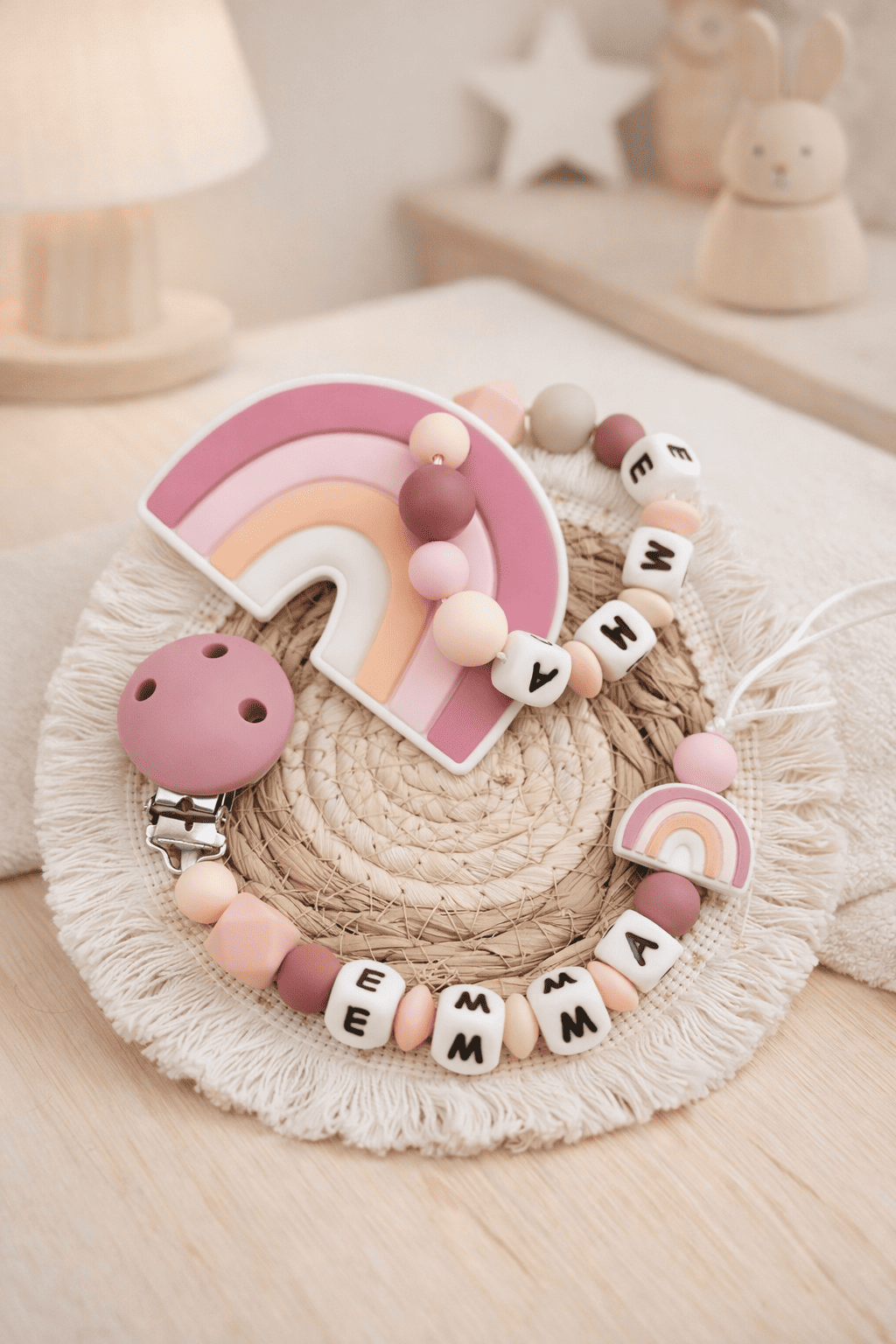 • Le duo comprend une attache tétine avec prénom et un anneau de dentition sans prénom.