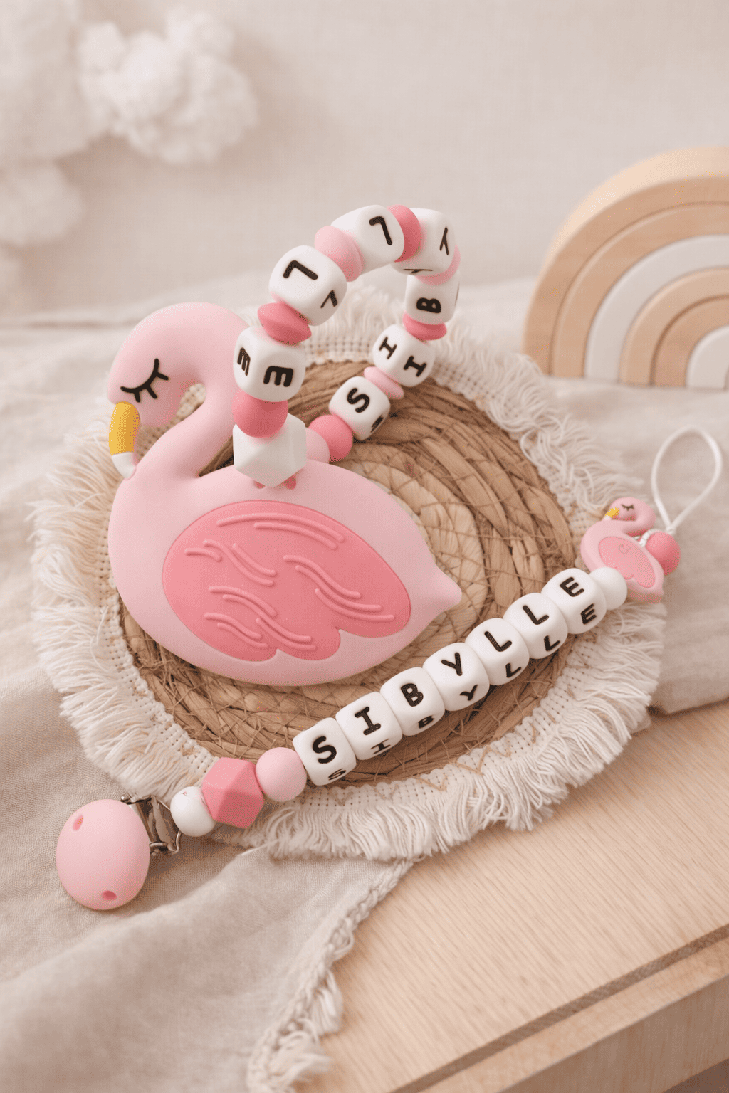 • Le duo comprend une attache tétine avec prénom et un anneau de dentition sans prénom.