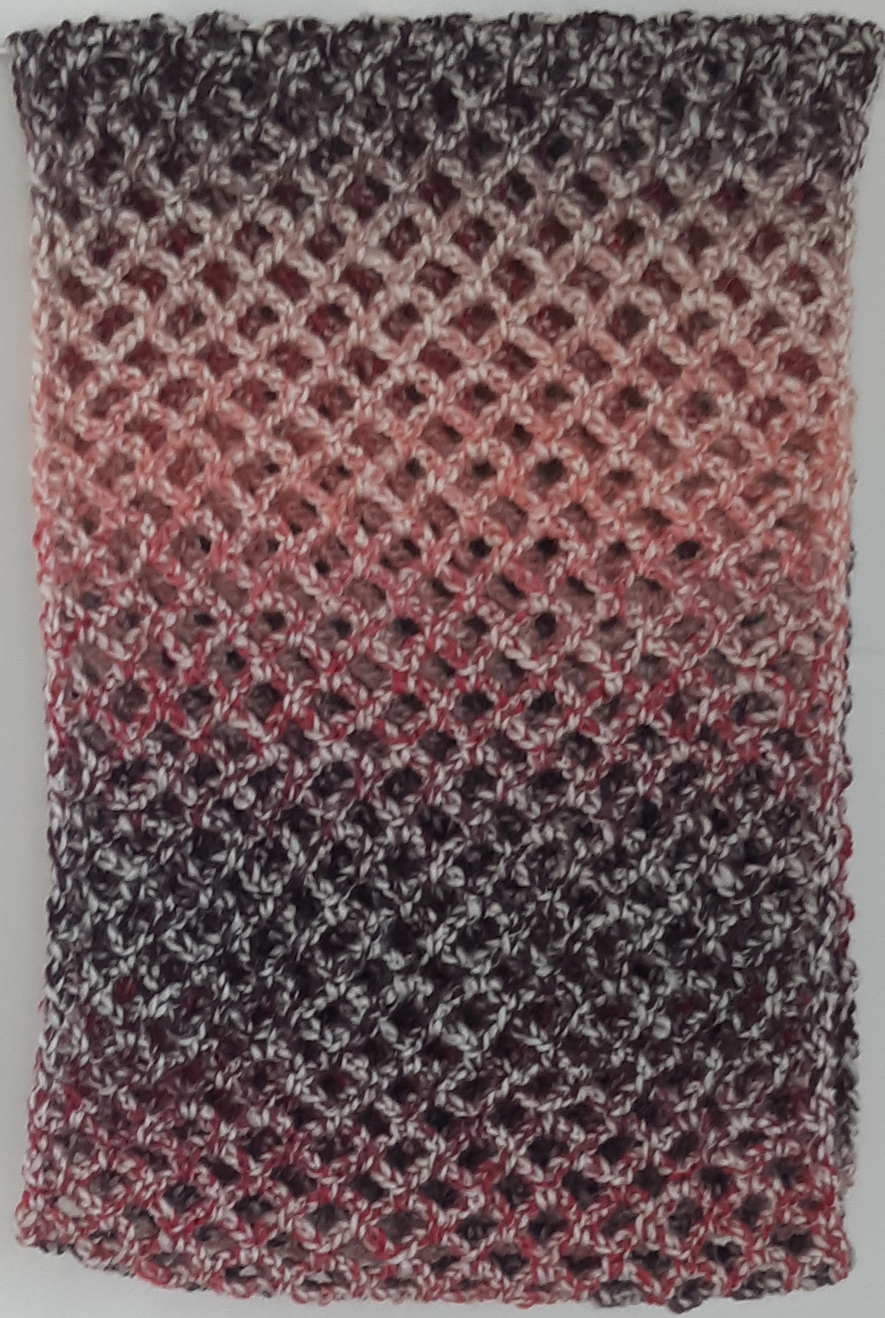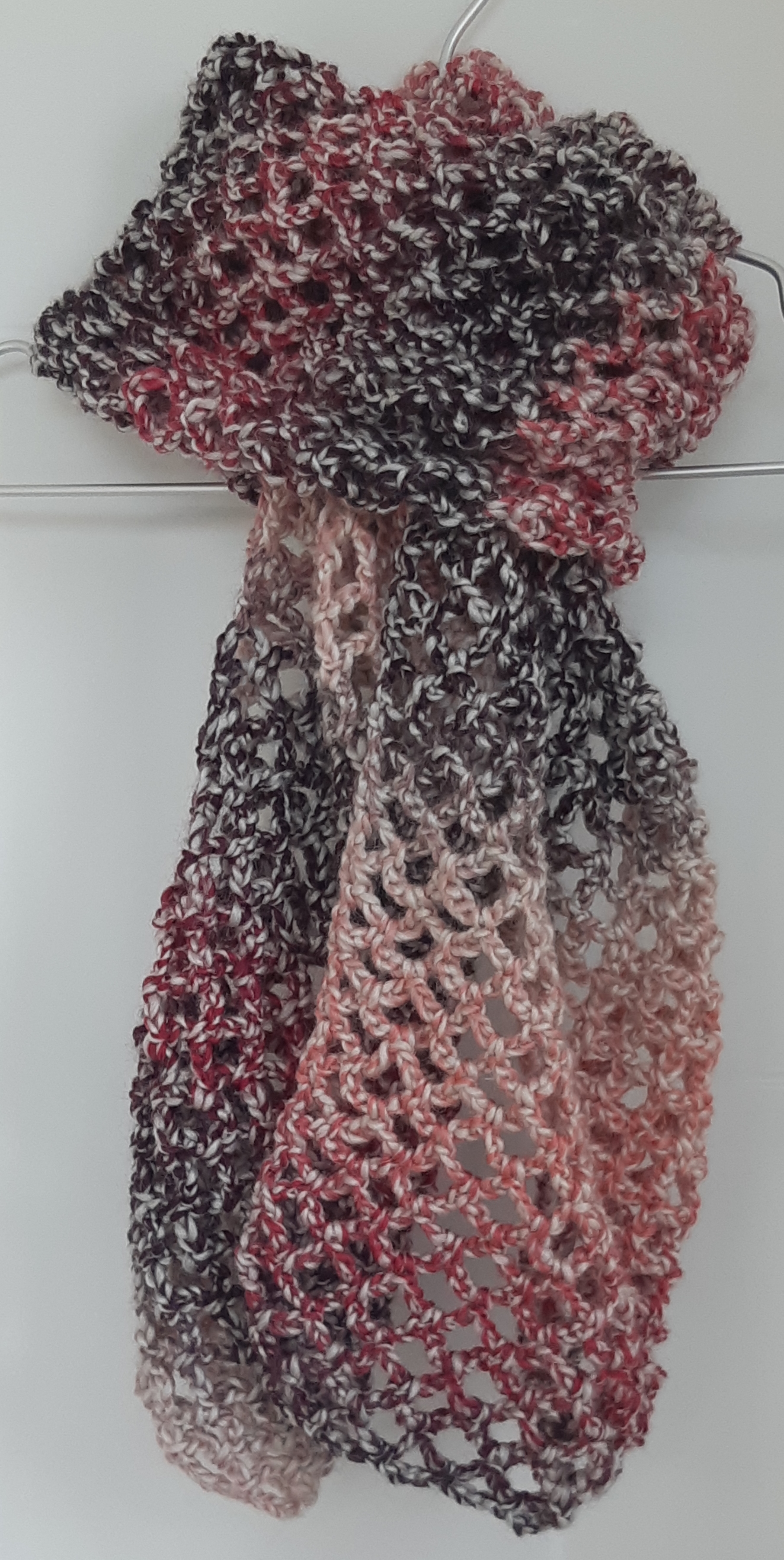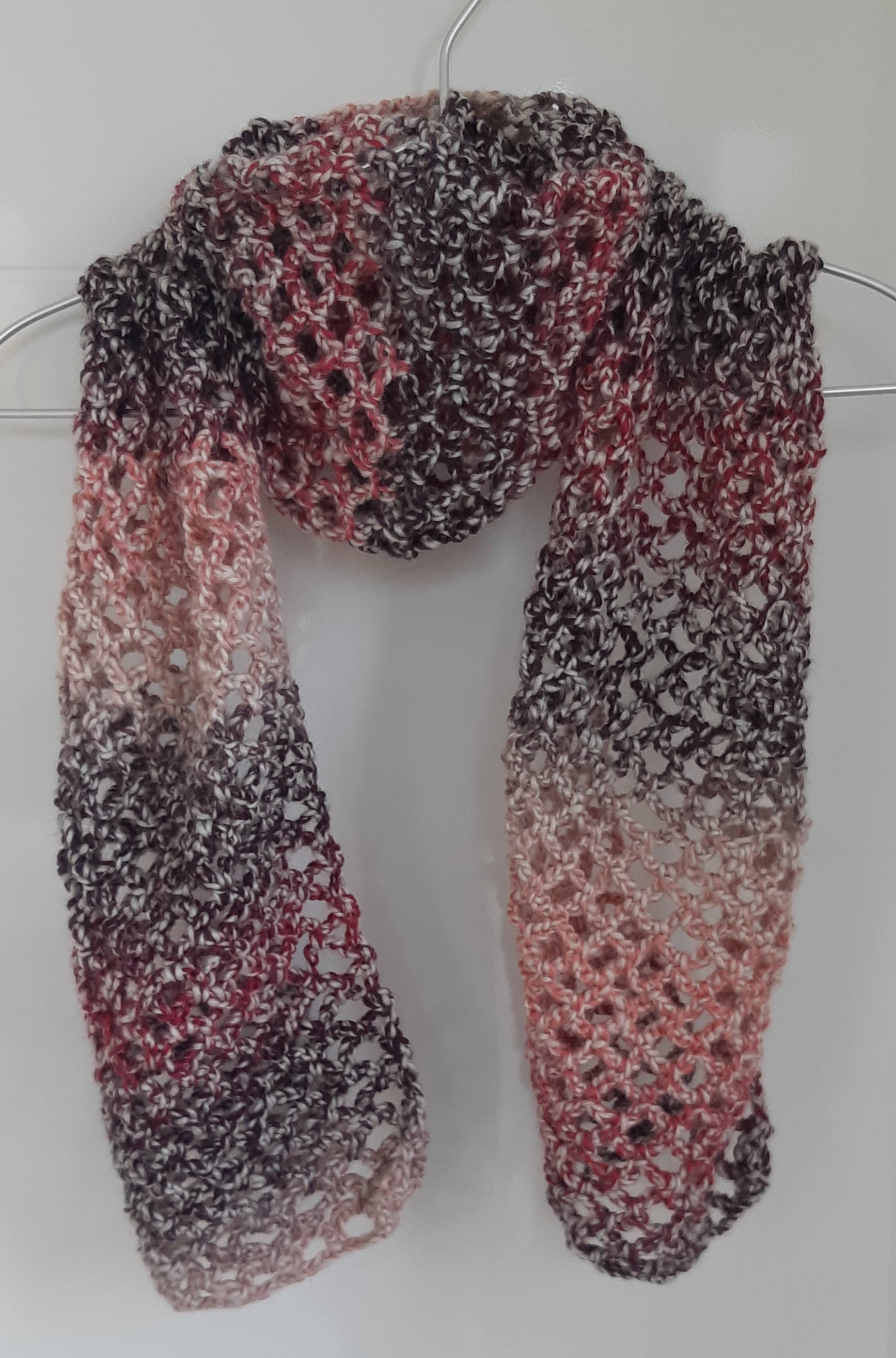 Cette écharpe toute douce et aux couleurs girly, dégradées de rose à prune, est réalisée au crochet.