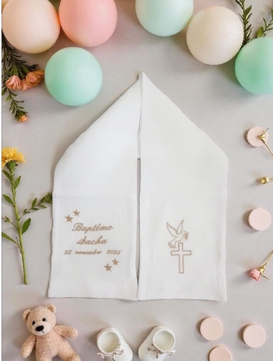 Echarpe de baptême bébé enfant brodée personnalisée en double gaze coton oekotex blanc.