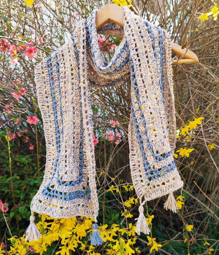 Cette écharpe de dentelle au crochet, ornée de petit pompon à chaque extrémité, donnera un côté unique et très chic à vos tenues.