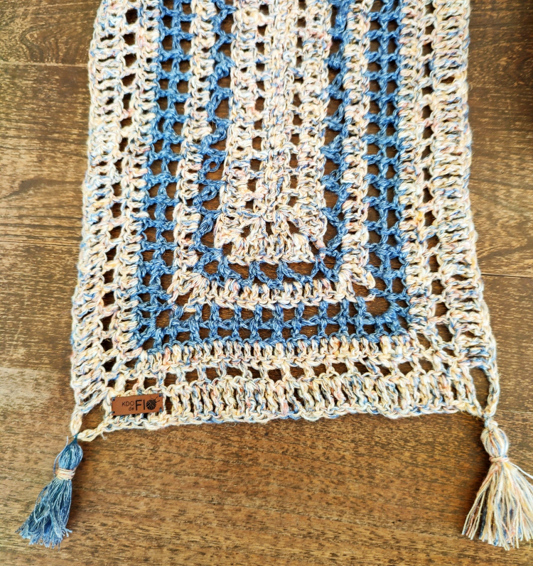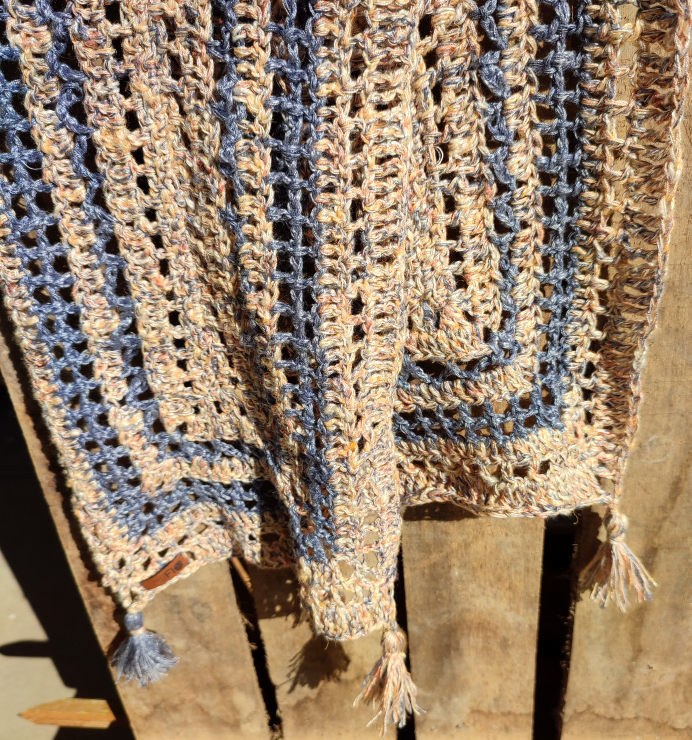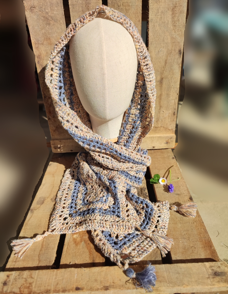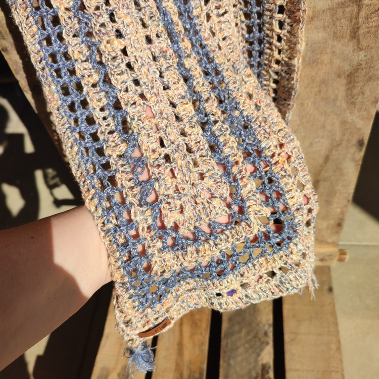 Elle a été réalisée avec un fil en provenance d’Italie aux couleurs assorties : un beau bleu “jeans” et un bariolé de pèche/jaune pâle/bleu “jeans”.