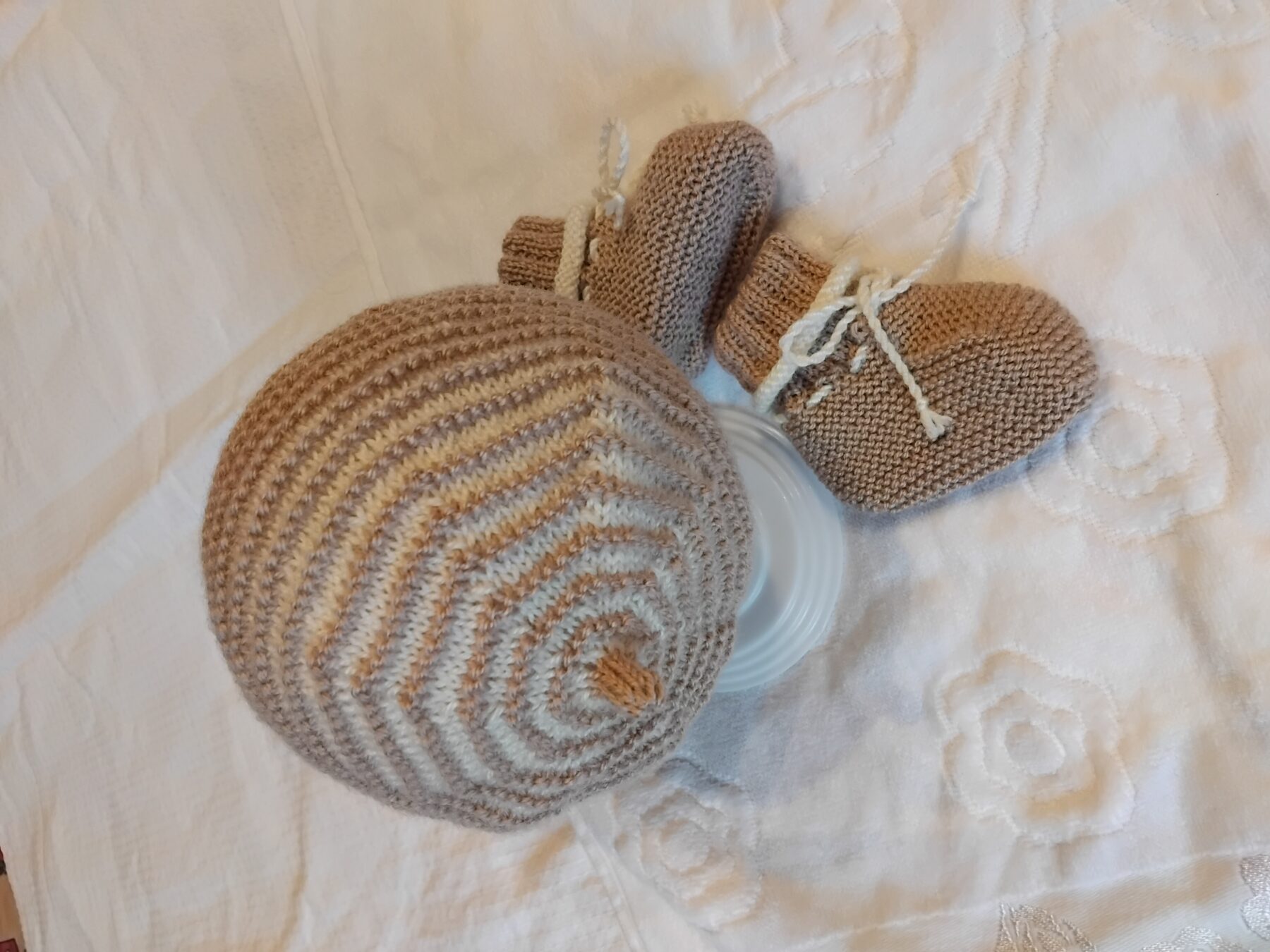 Jolie ensemble naissance tricoté à la main avec de fil 50% laine mérinos – 50% acrylique
