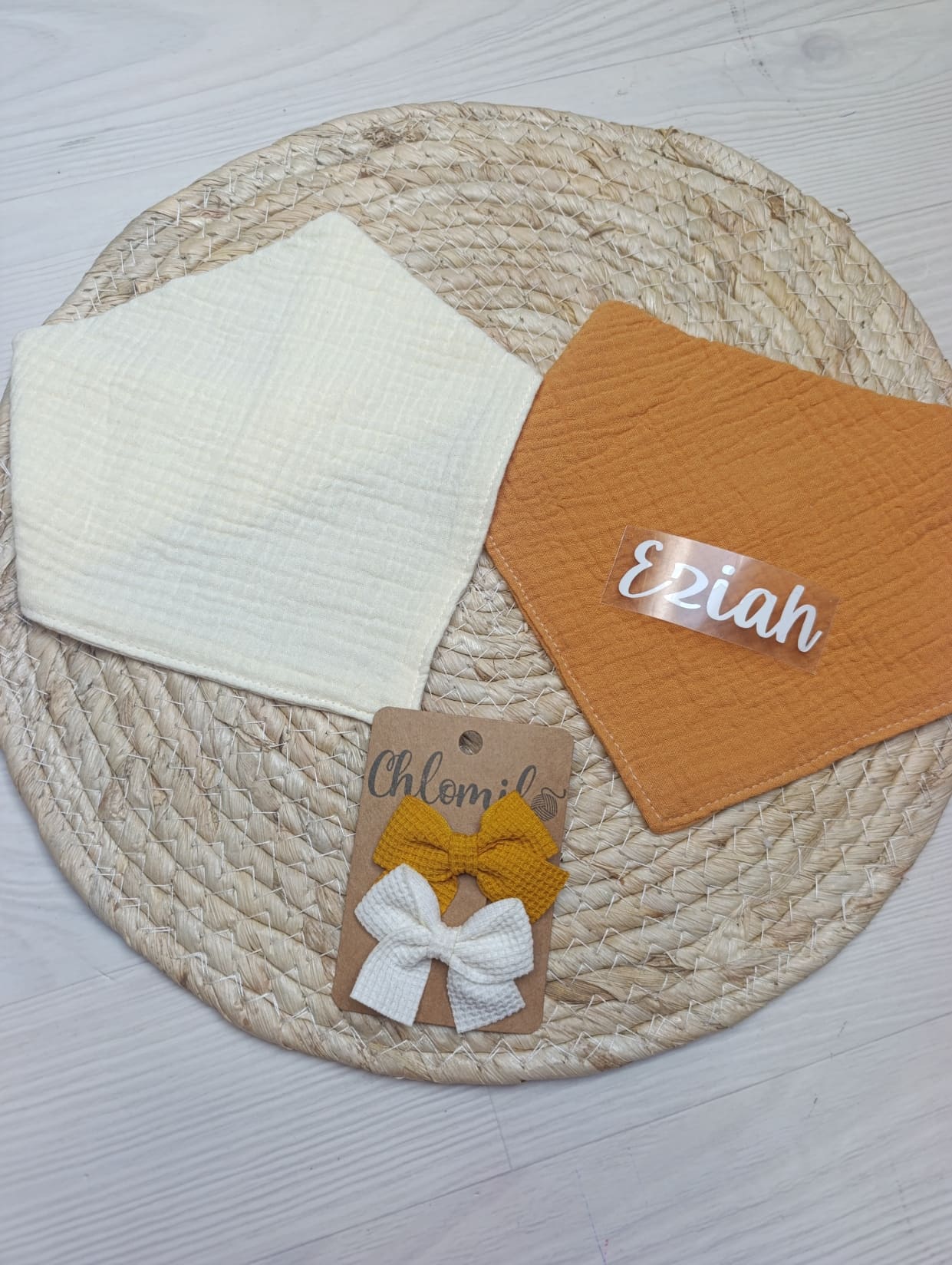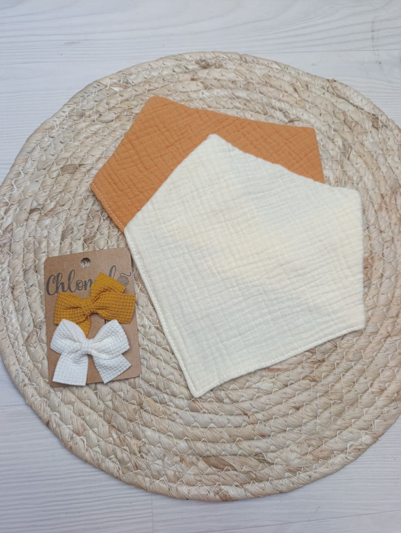 Ensemble cadeau composé d’un lot de 2 bavoirs bandana en double gaze de coton écru/ safran et 2 barrettes assorties