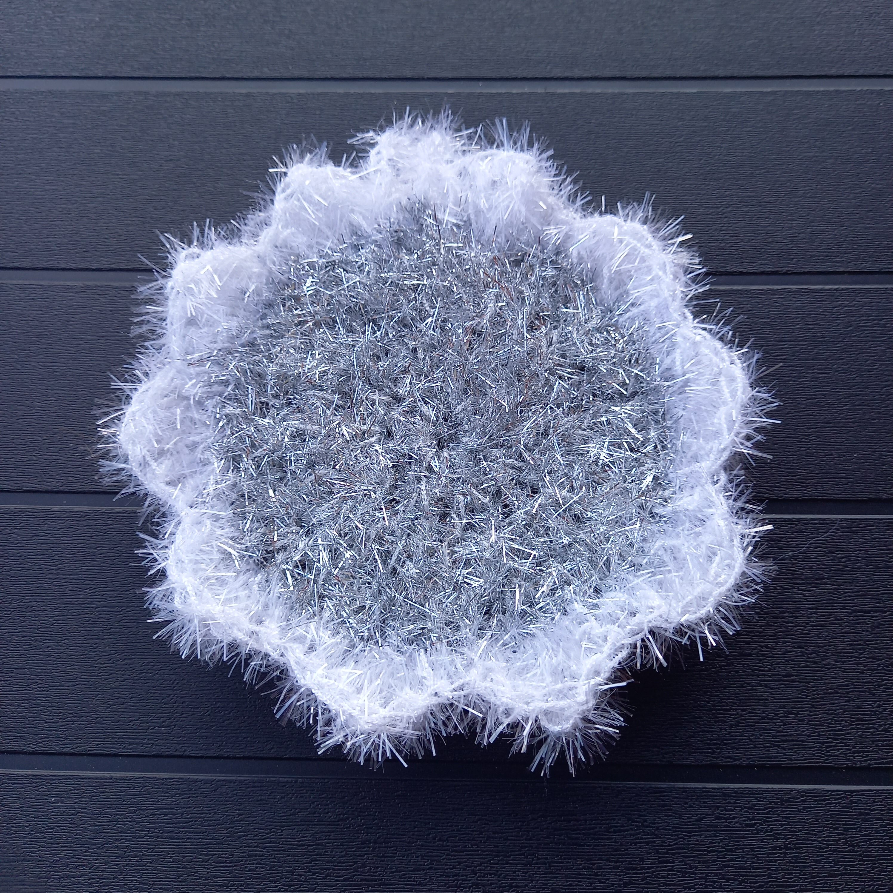 Dans une démarche zéro déchet, Loremax créations a confectionné pour vous une jolie éponge ou fleur de douche dans les tons de gris argenté et bord blanc !