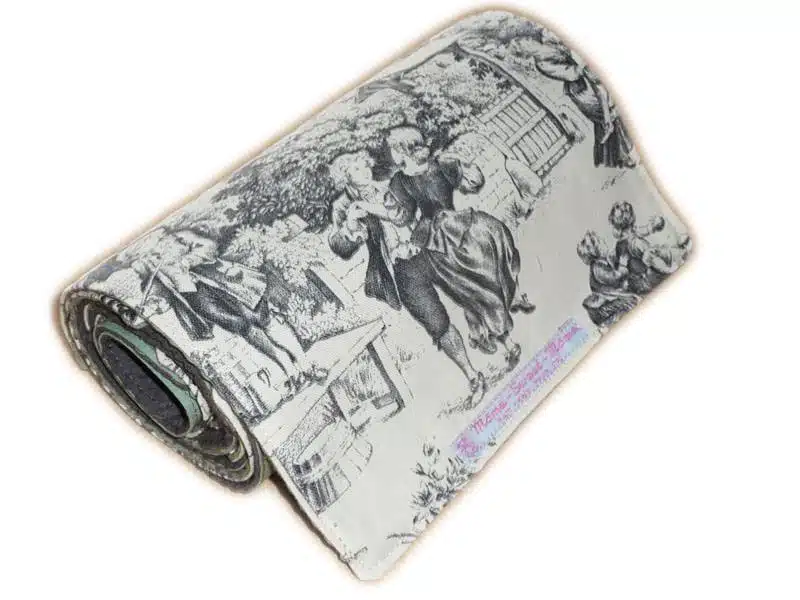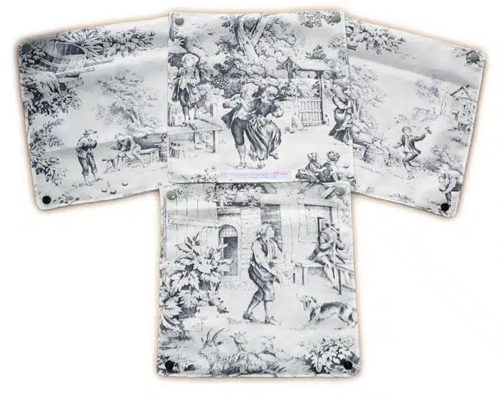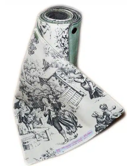 MATIERES : MATIERES : Recto : 100% coton imprimé et uni TOILE DE JOUY Oeko-Tex / Verso : éponge nid d’abeille 100% coton Oeko-Tex/ Fixation : pressions Oeko-Tex