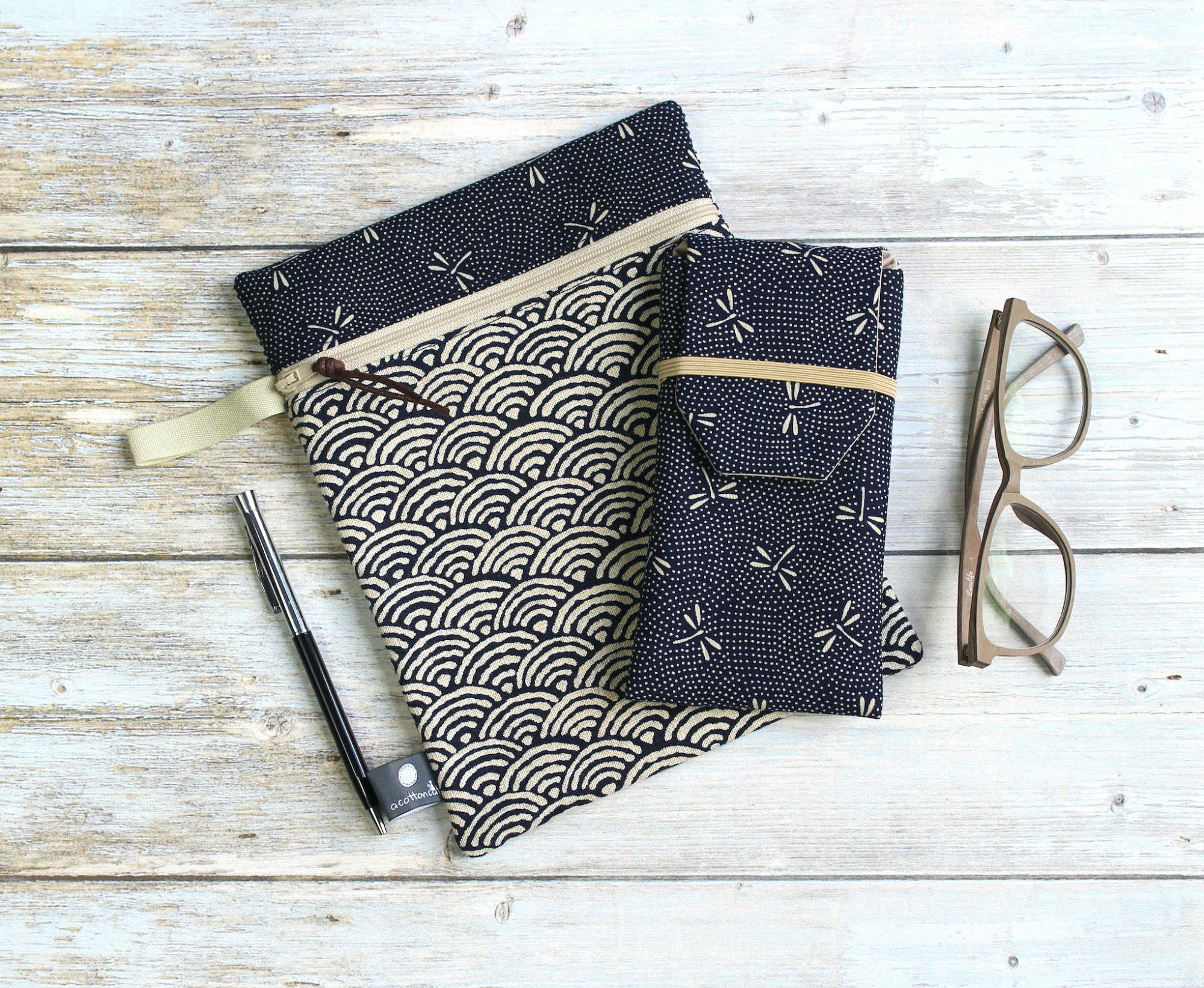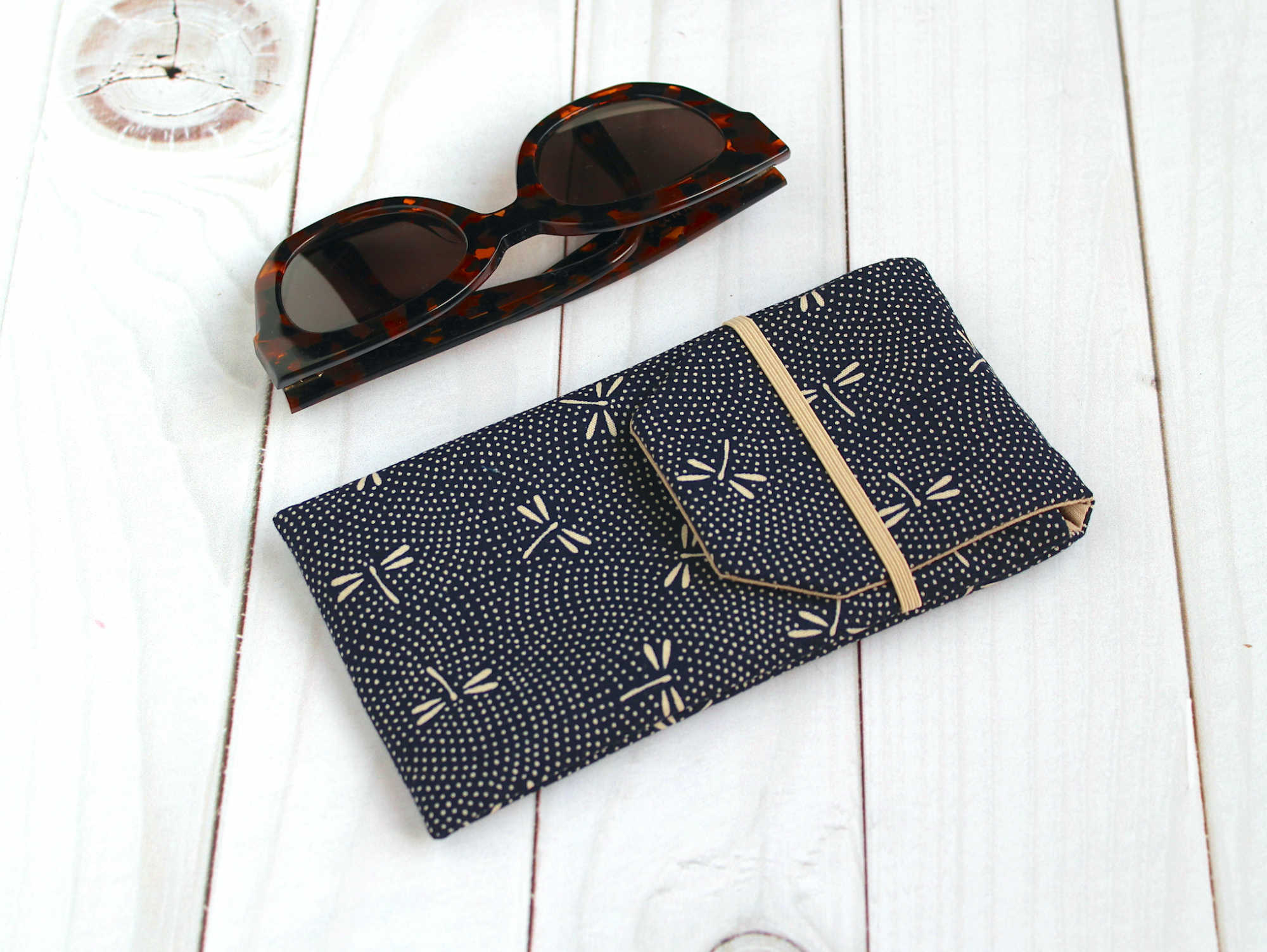 Pochette à lunettes en tissu coton japonais libellules sur fond bleu nuit. Accessoire à lunettes pratique pour le rangement et protection de vos lunettes, de vue et de soleil. Pour femme et pour homme.