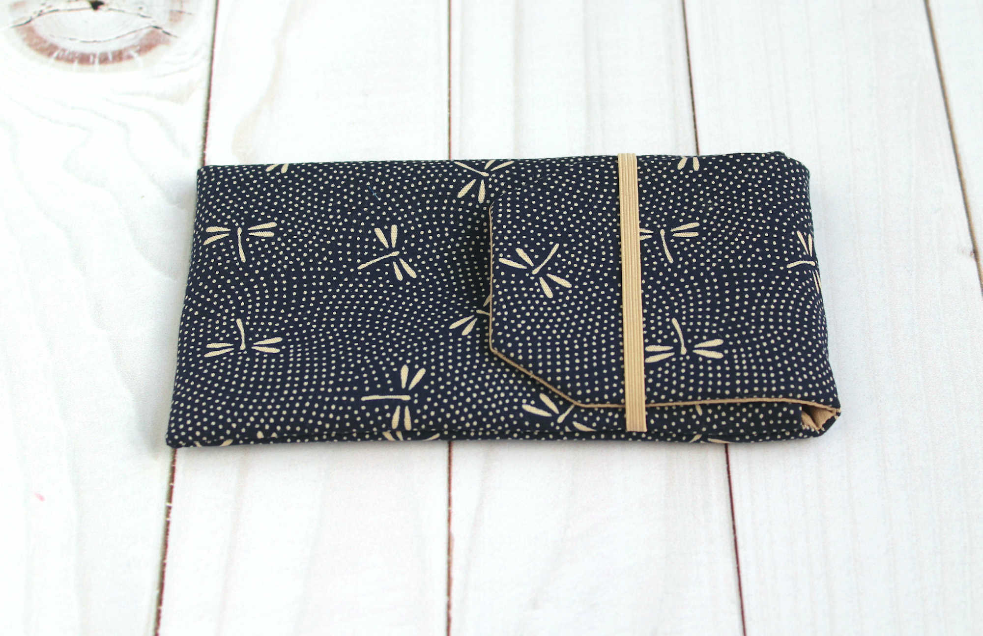 Etui entièrement doublé en coton, il comporte un rabat permettant la fermeture avec une bande élastique bleue. Vous pouvez assortir cet accessoire japonais avec un protège chéquier ou une pochette, idée cadeau pour les fans du Japon!