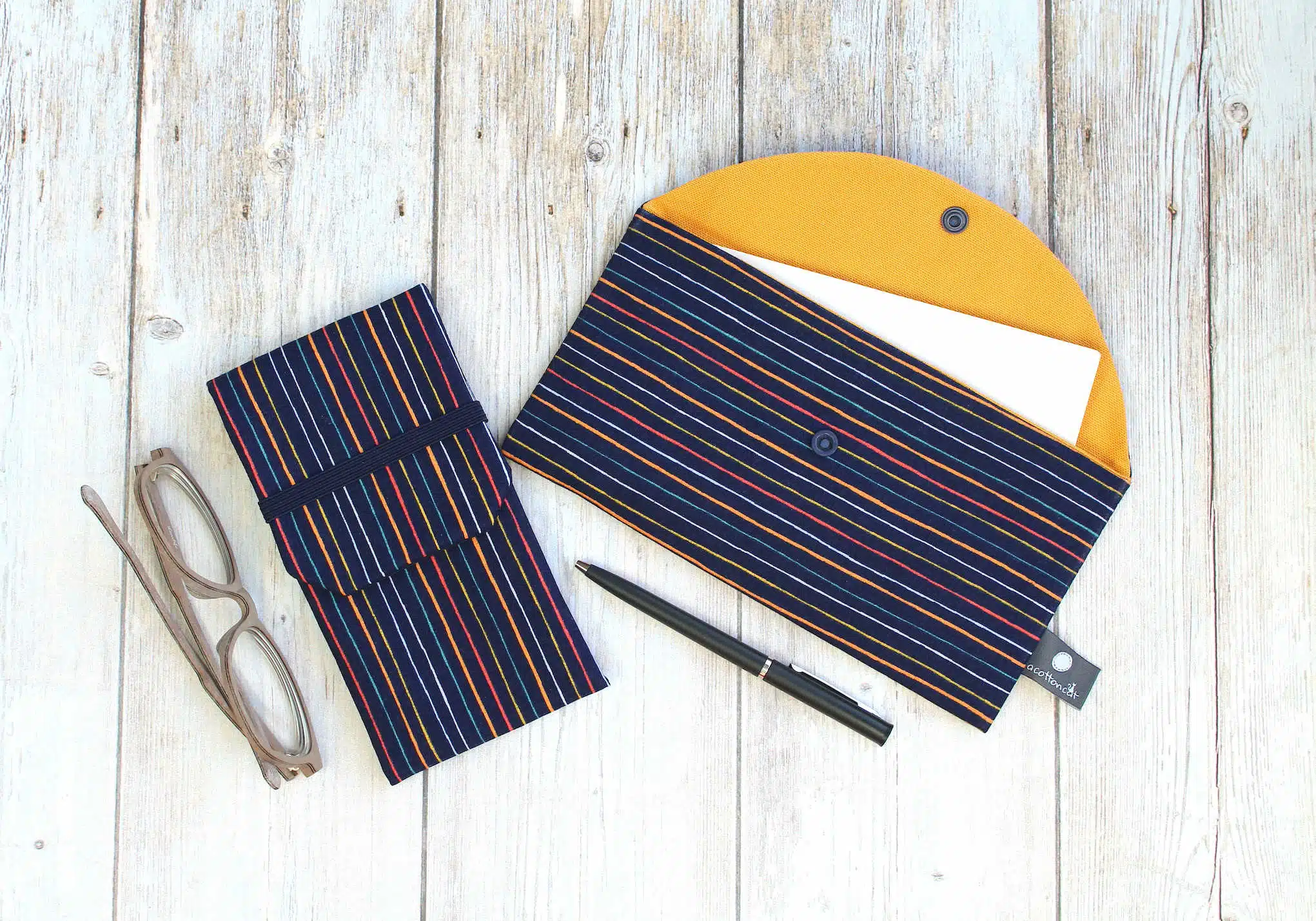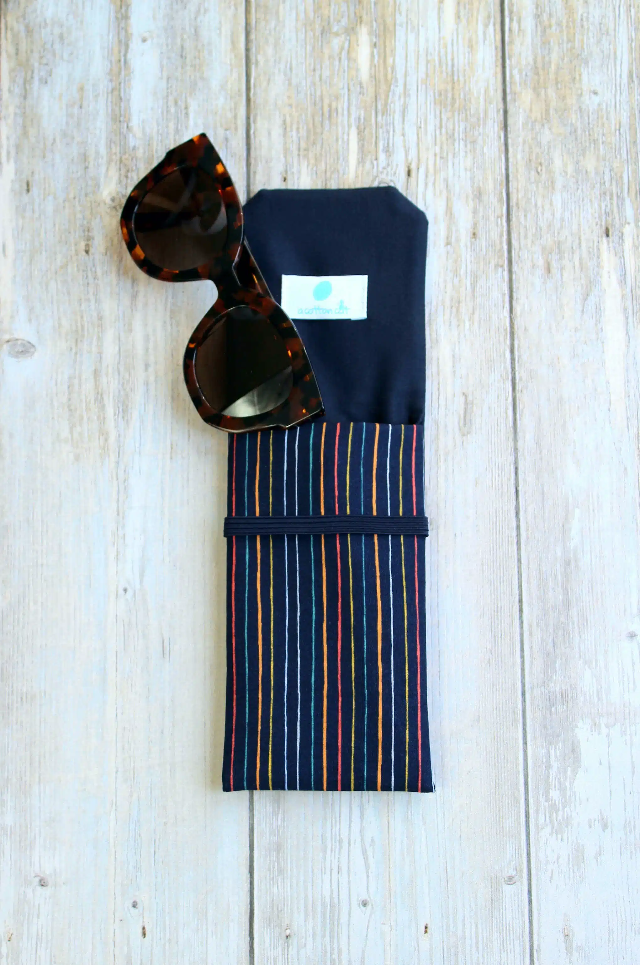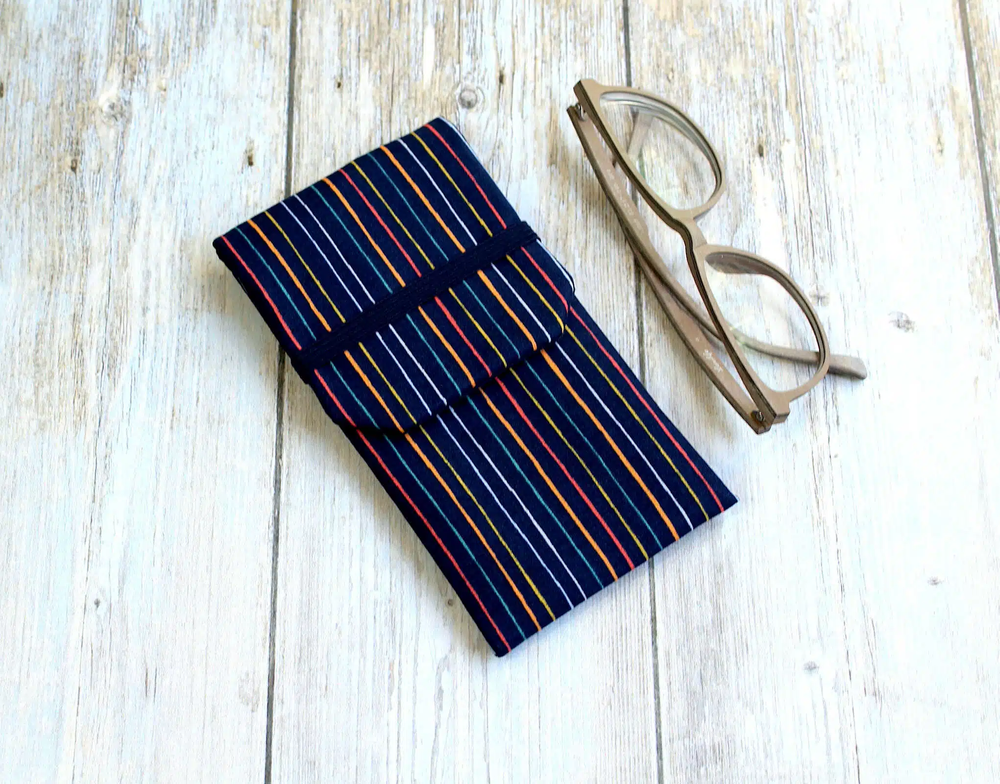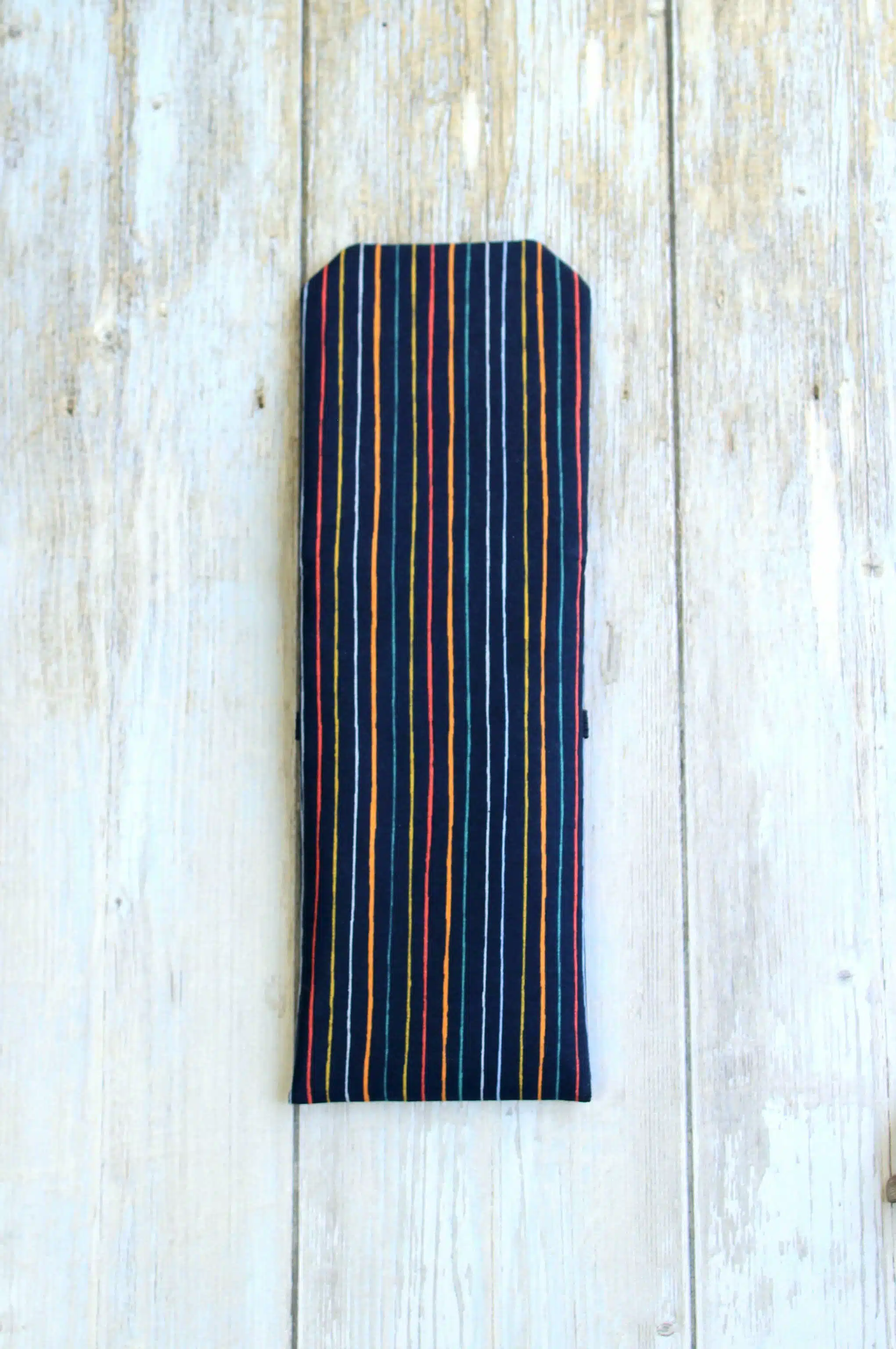 Pochette à lunettes en tissu coton à motifs rayures multi couleurs sur fond bleu nuit. Étui à lunettes pour homme et pour femme. Il peut vous servir pour rager vos lunettes de soleil et de vue.