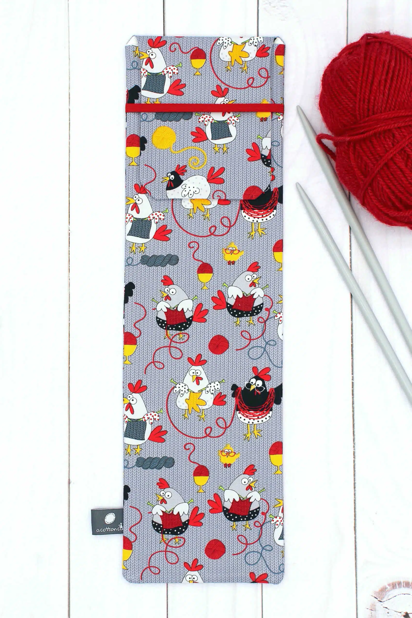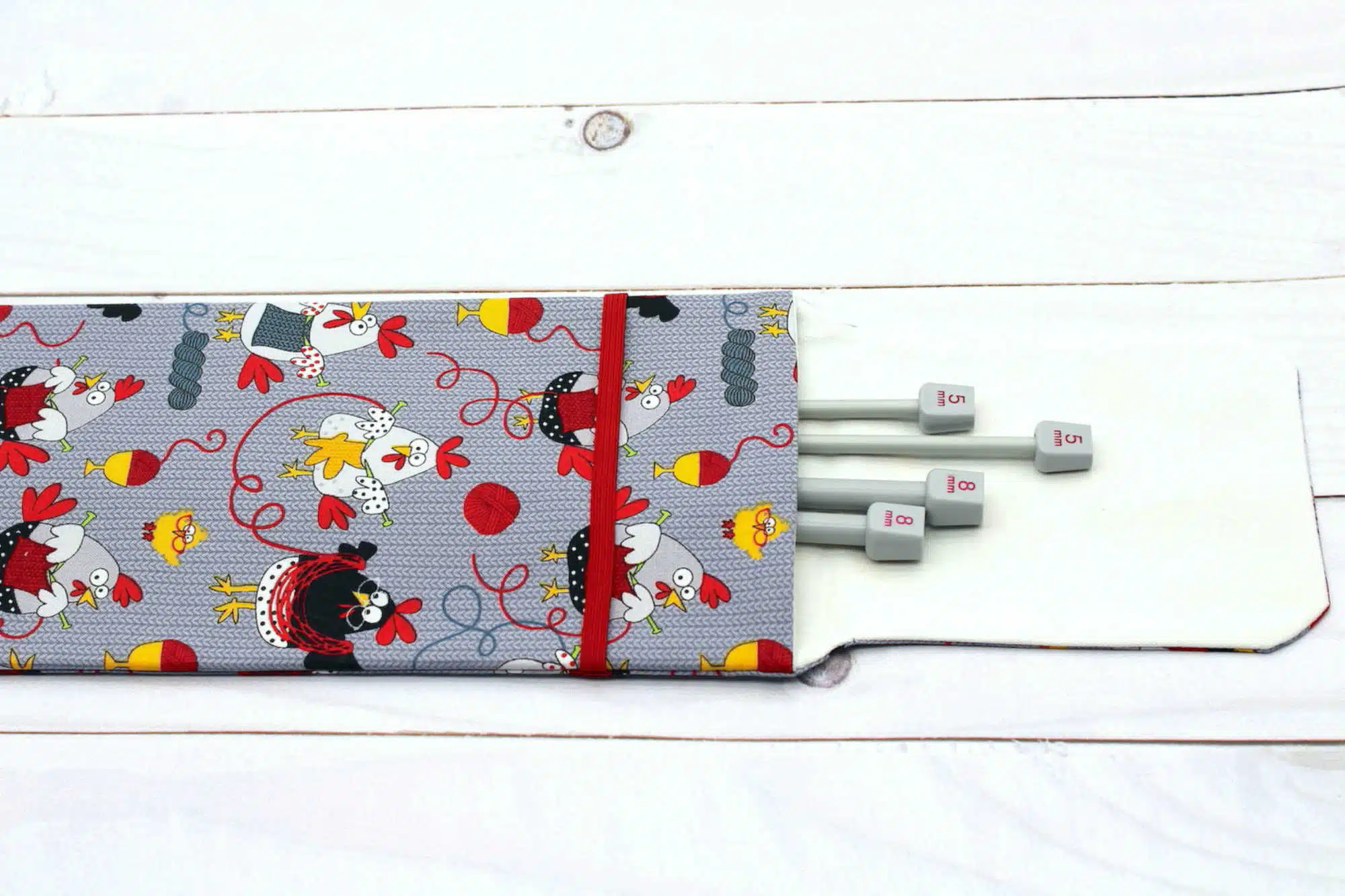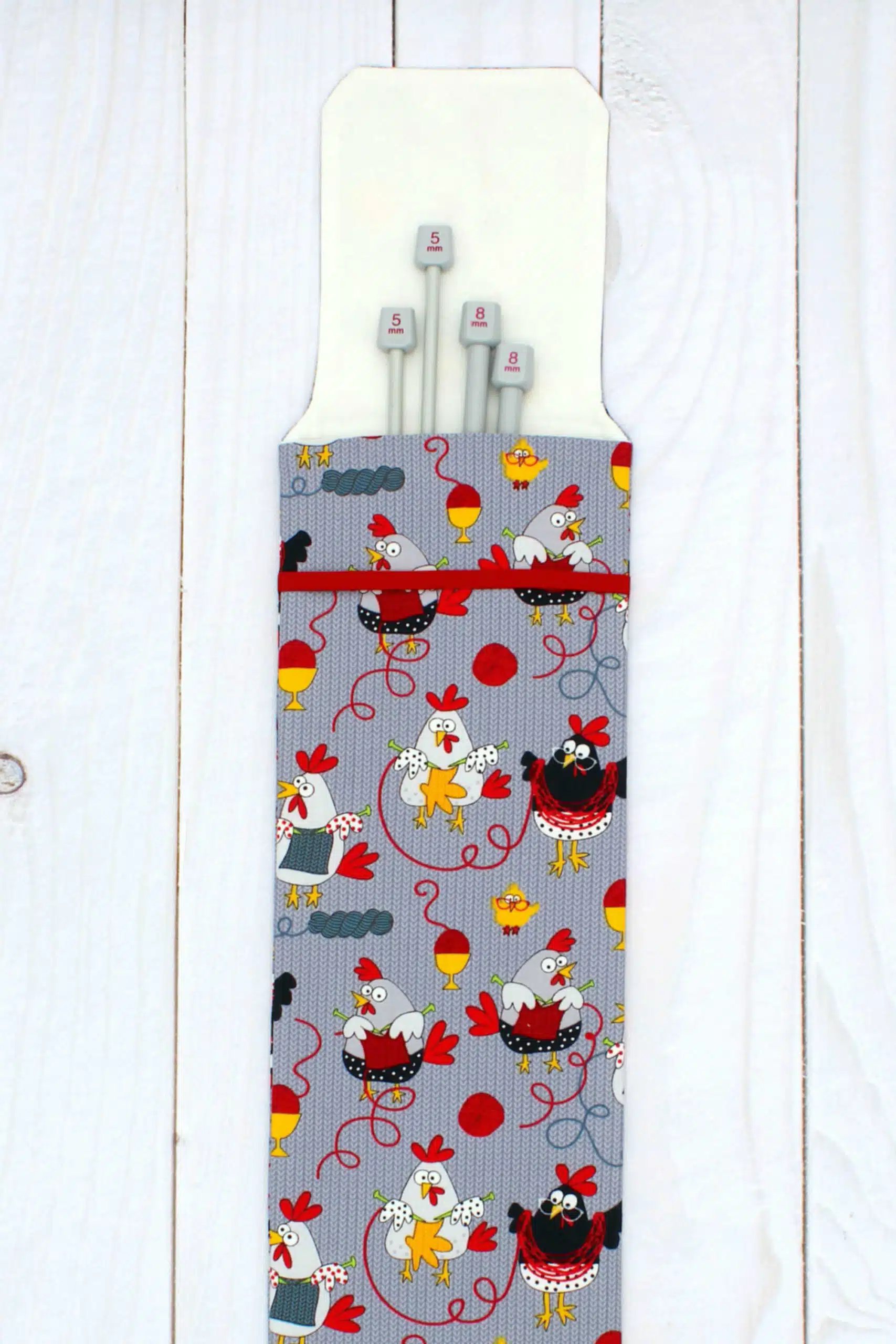 Trousse pour aiguilles à tricot droites. Pochette tricot confectionnée en coton épais blanc et combinée avec un coton à motifs poulettes tricoteuses sur fond gris. Idée cadeau pour femme tricoteuse!