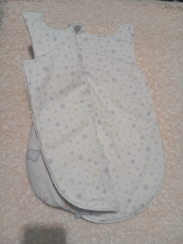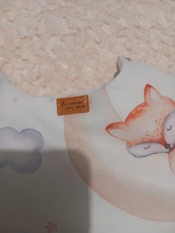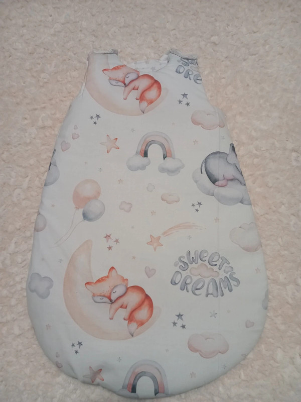 voici une gigoteuse en coton blanc motif renard ,intérieur coton épais blanc motif étoilé doublé ouate ,fermeture eclair d’en haut jusqu’en bas et pression aux épaules ,taille naissance a 3 mois