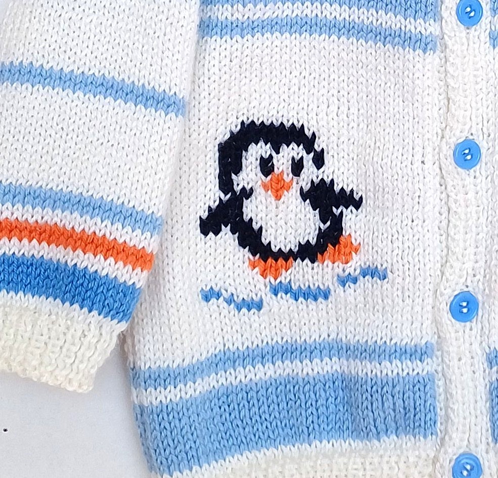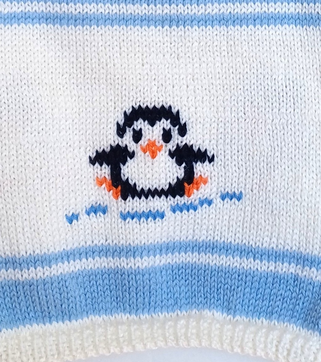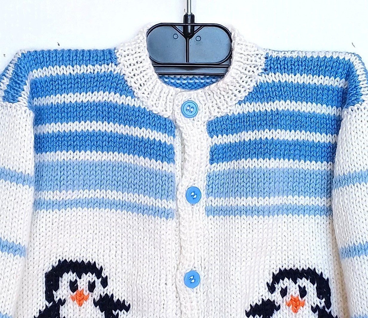 Gilet bébé au tricot, layette fait main, en laine, avec des pingouins taille 6 mois