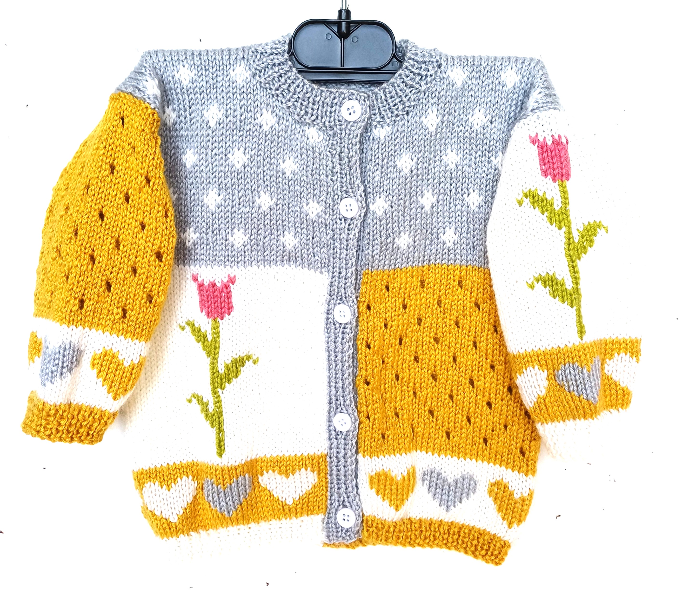 Le gilet est blanc, gris clair et jaune “soufre” avec une partie ajourée et une partie avec des fleurs brodées, les cœurs sont aussi brodés.