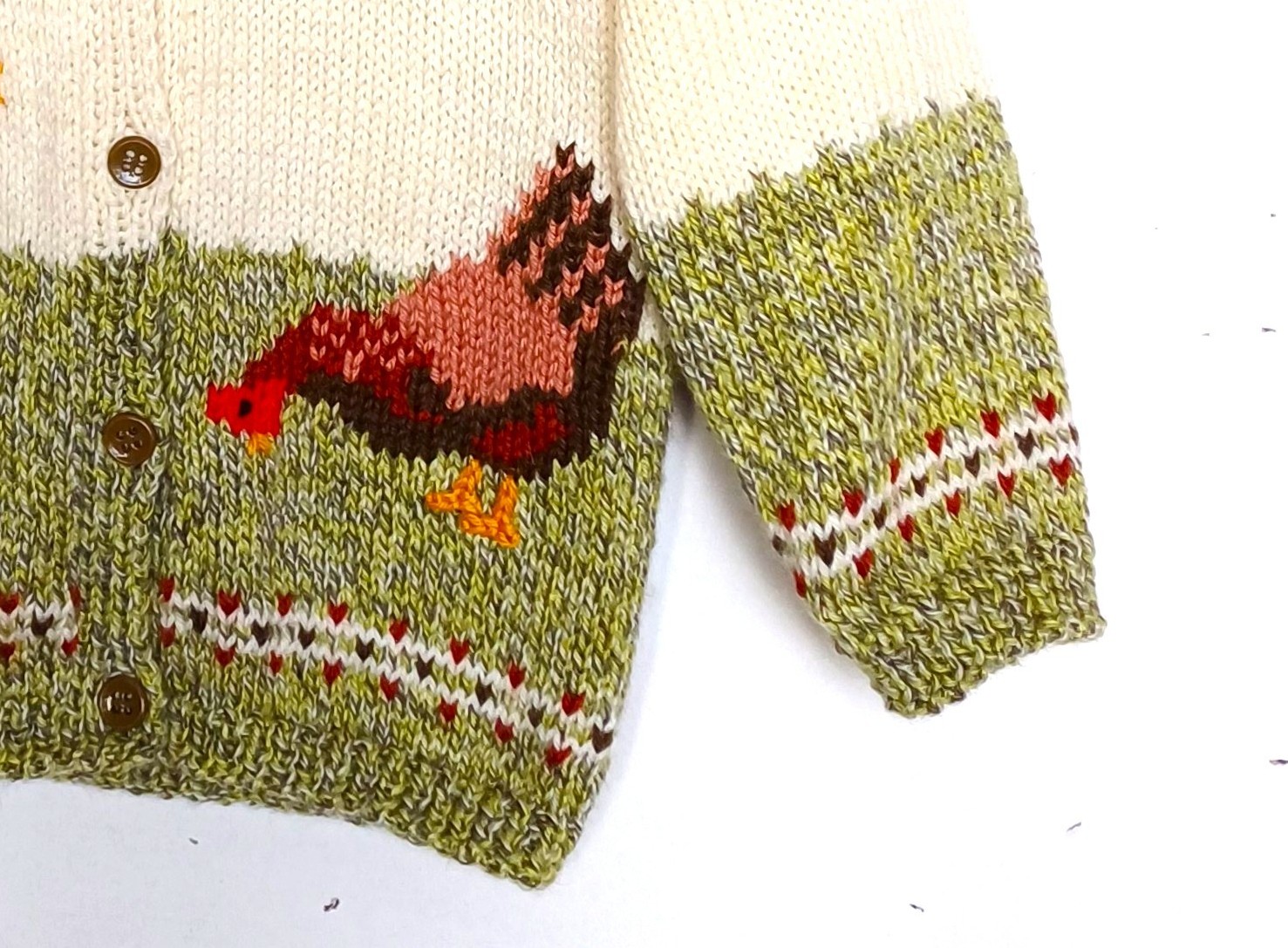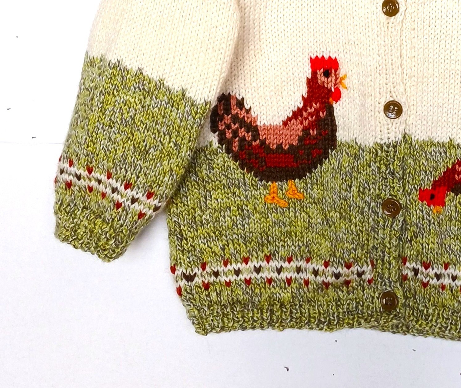 Ce gilet avec des poules, est tricoté main, en laine, c’est une taille 1 an