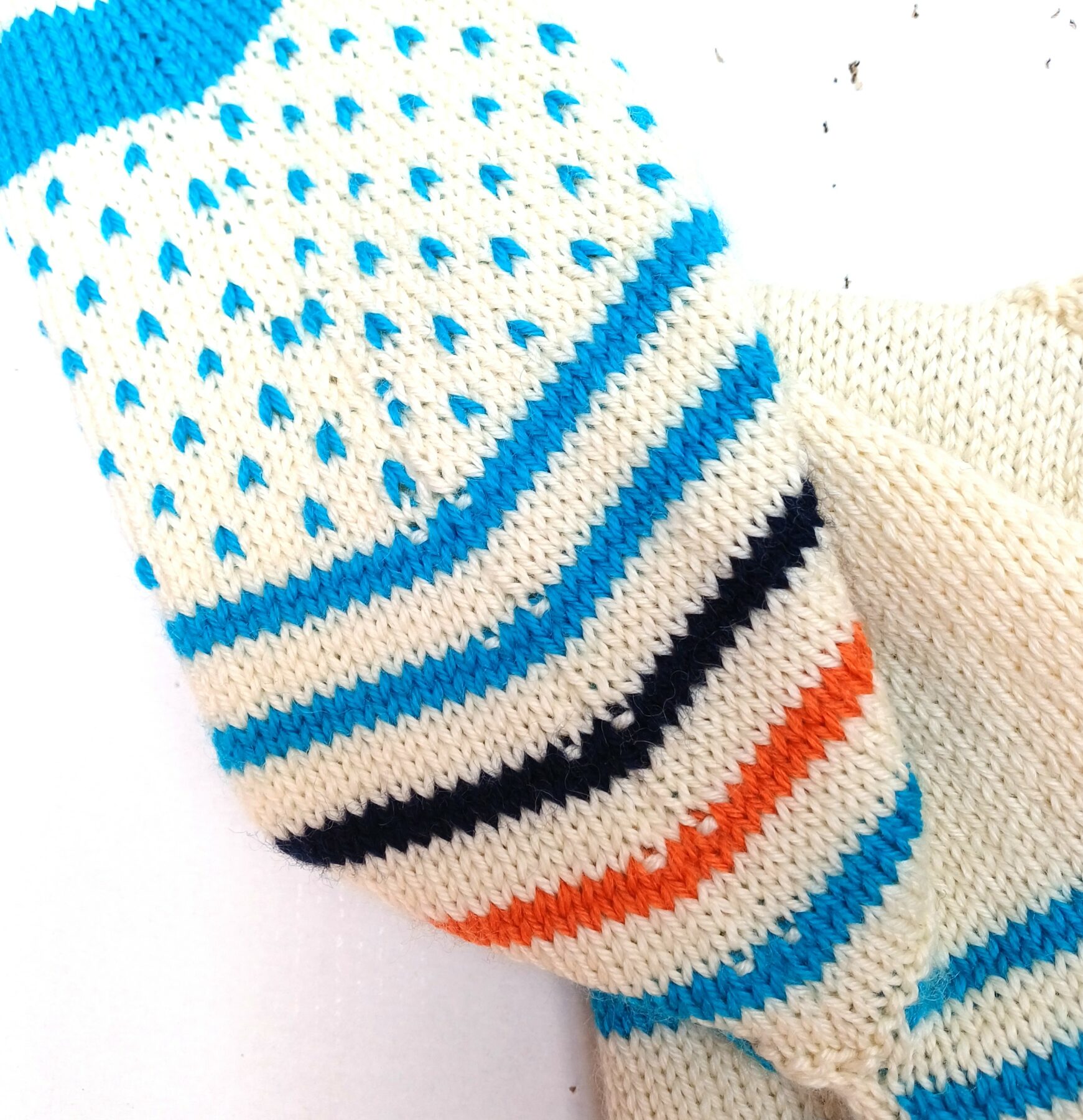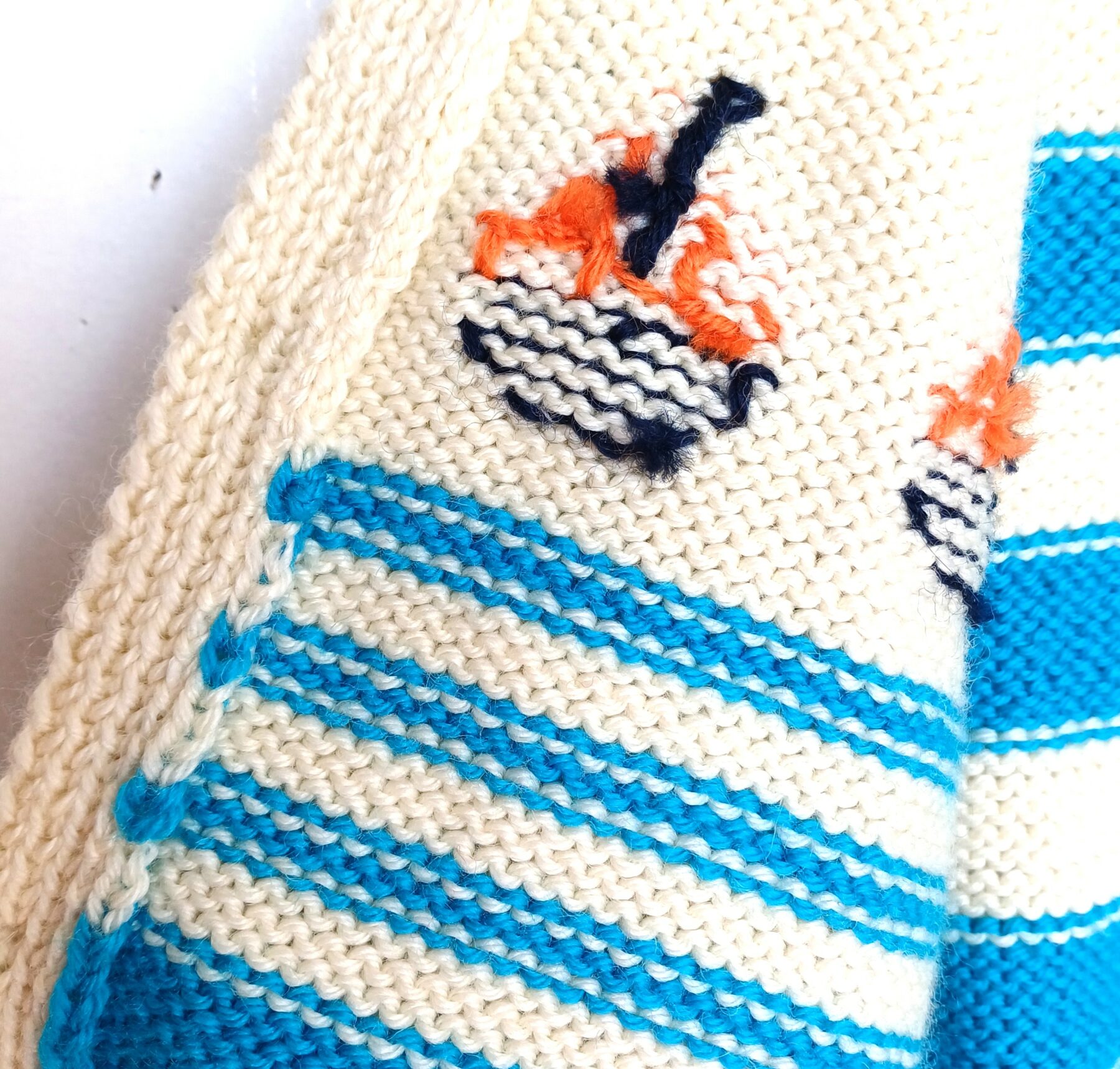 Gilet blanc écru et bleu turquoise avec 3 bateaux brodés sur le devant et un rappel marine et orange sur la manche.