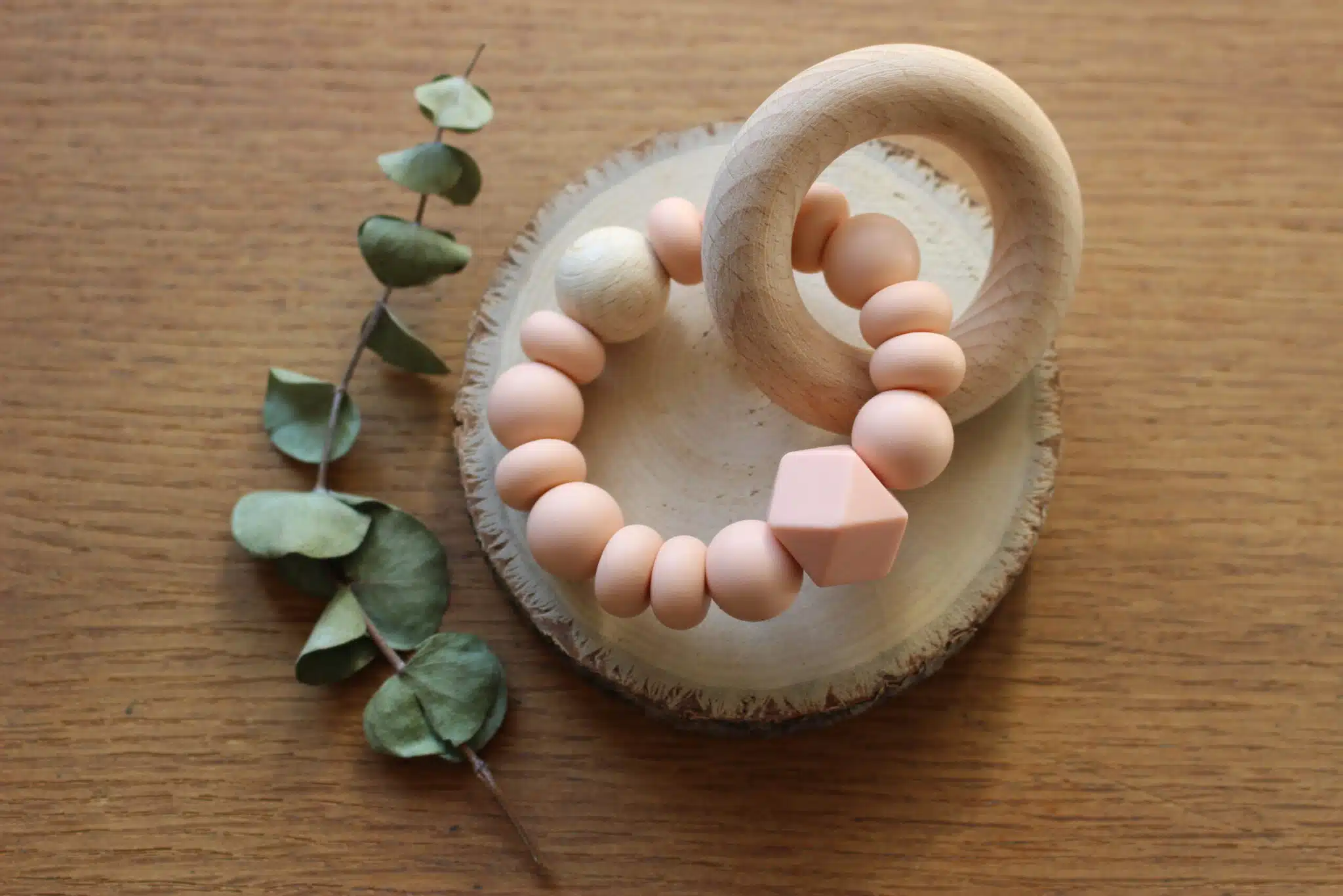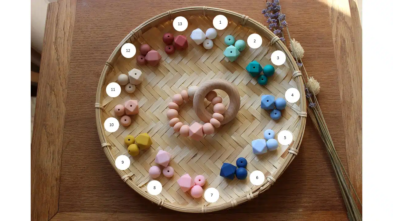 Il est conçu à l’aide de perles et d’anneaux en bois naturel, non traité ainsi que de perles en silicone alimentaire.