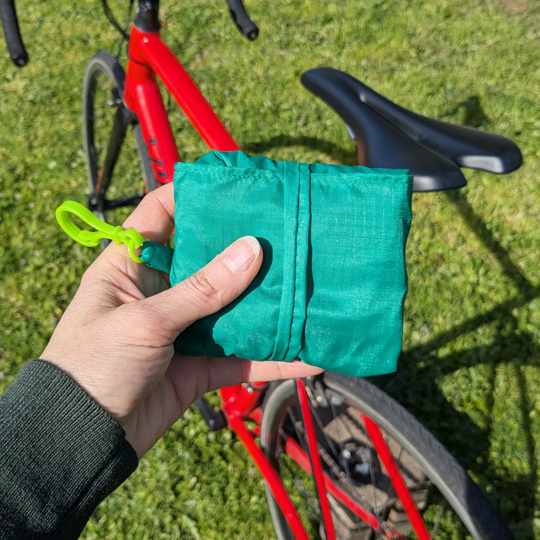 Dotée d’une attache type mousqueton, la housse s’attache sur le vélo une fois pliée, ou bien rangé dans vos affaires sans encombrement.