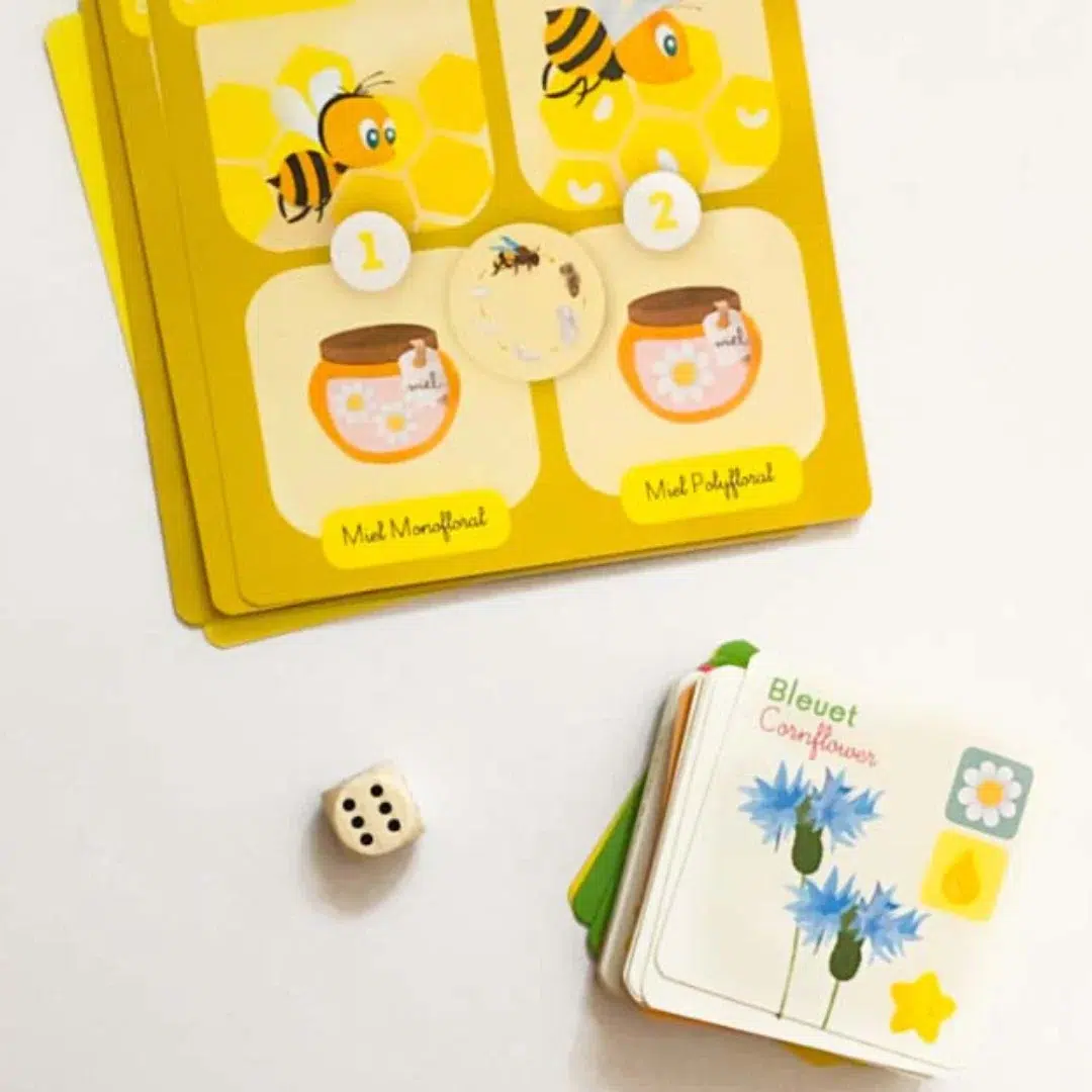 Le jeu est conçu pour être simple, accessible et agréable pour les enfants de 5 à 12 ans ( régles évolutives ). Chaque joueur lance le dé et pioche une carte correspondant au résultat. Par exemple, si le dé indique “1”, le joueur pioche une carte fleur qui peut contenir du nectar, du pollen ou les deux. Lorsque l’enfant récolte du pollen, il peut le poser sur sa grande carte mission pour réaliser une étape clé de la vie de l’abeille, comme la pollinisation des fleurs ou la fabrication du miel.