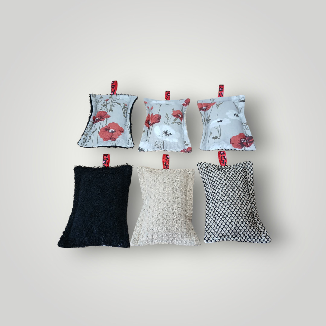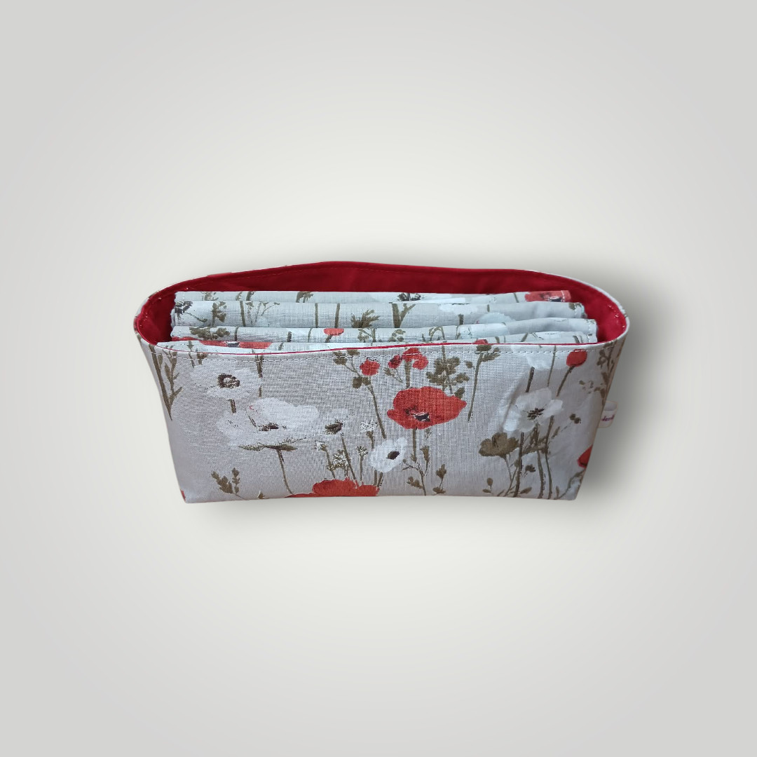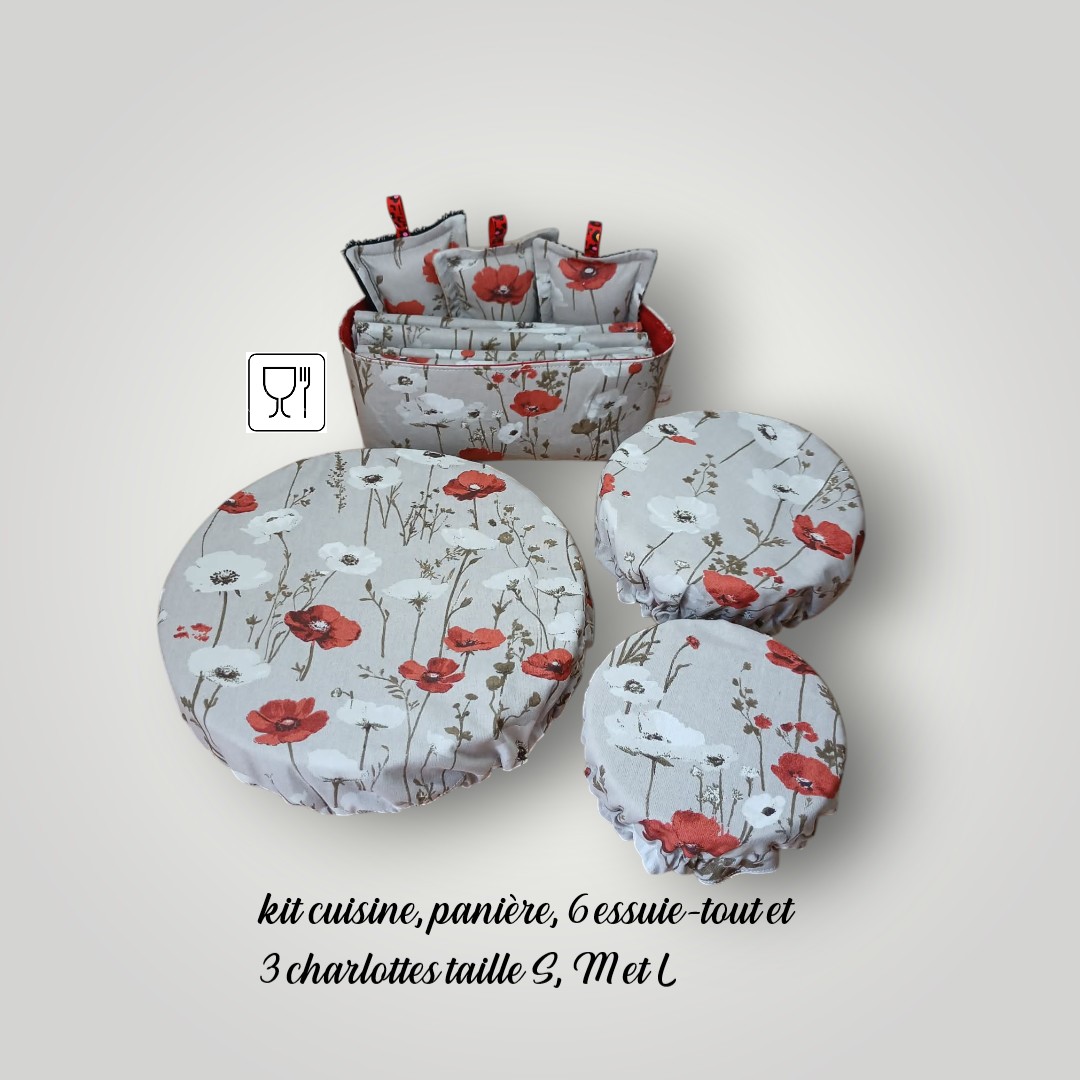 Je vous propose un ensemble zéro déchet pour la cuisine. Il est cousu dans un coton de qualité certifié OEKO-TEX au motif coquelicots rouges et blancs sur un fond gris. Les essuie-tout sont doublés d’éponge nid d’abeille vert sauge. Les charlottes sont doublées de PUL certifié contact alimentaire de coloris blanc. Les éponges sont doublées d’éponge, d’éponge nid d’abeille et de filet mesh aux coloris en adéquation avec le coton imprimé. La grande panière est doublée d’un coton rouge.