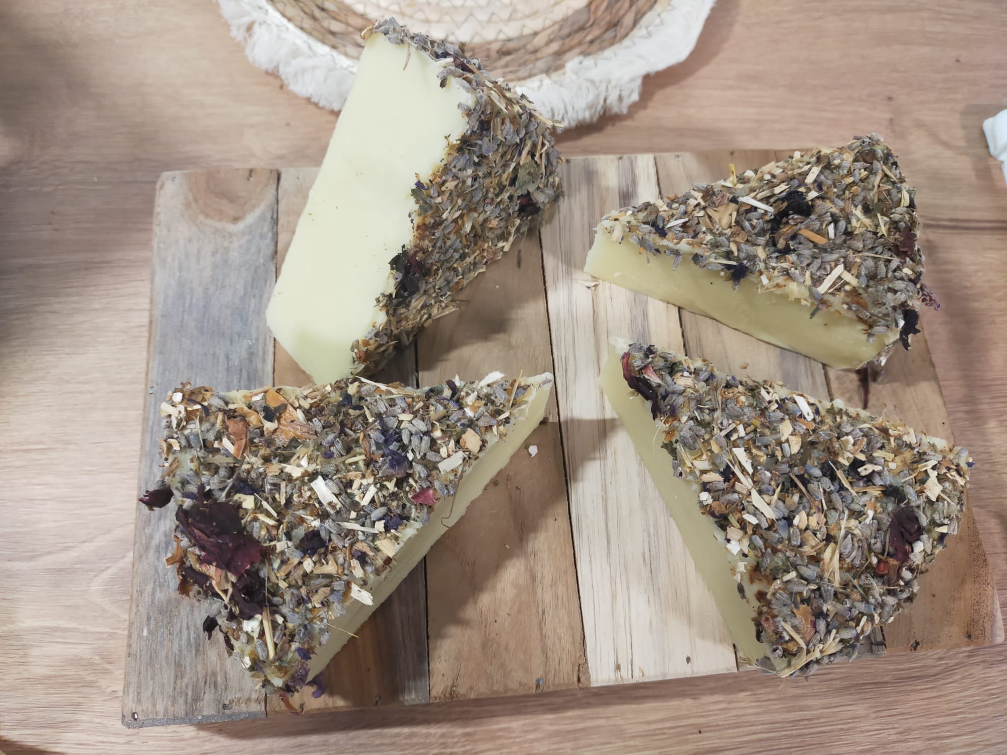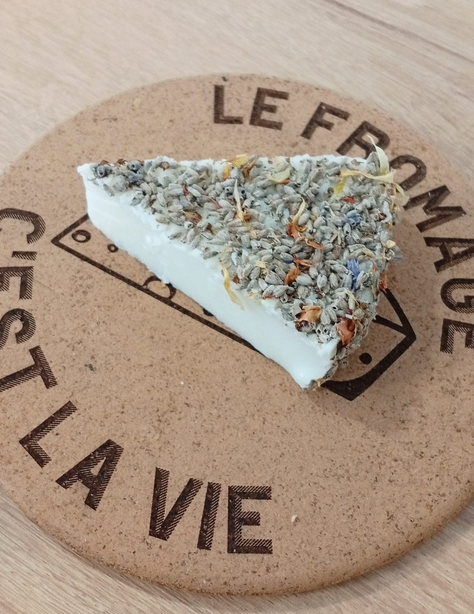 Savon décoratif en forme de Tomme de Fleurs orné de fleurs séchées, inspiré des fromages fleuris. Une création poétique et naturelle qui apporte une touche champêtre à votre intérieur.