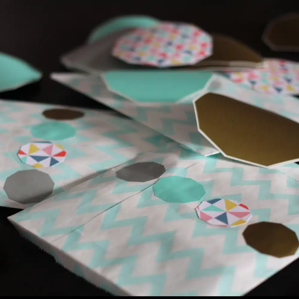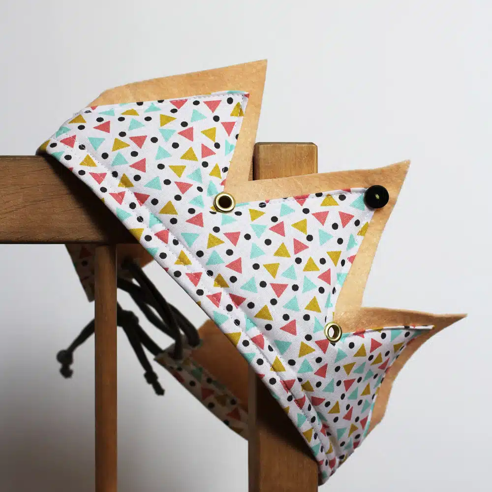 Les badges ronds sont recouverts de 3 tissus à motifs et coloris différents, de la collection Piko,
