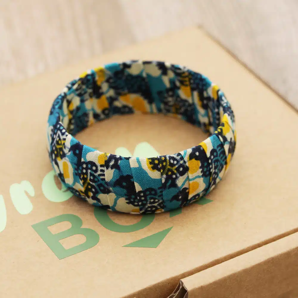> Bracelet en dur enveloppé d’un joli tissu fleuri.