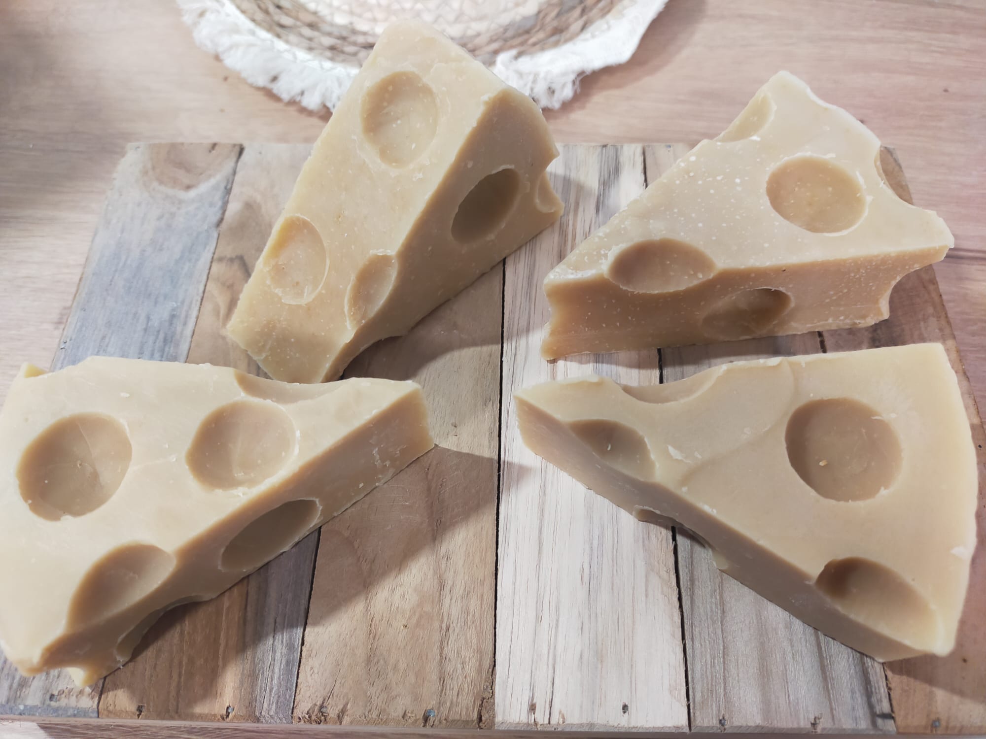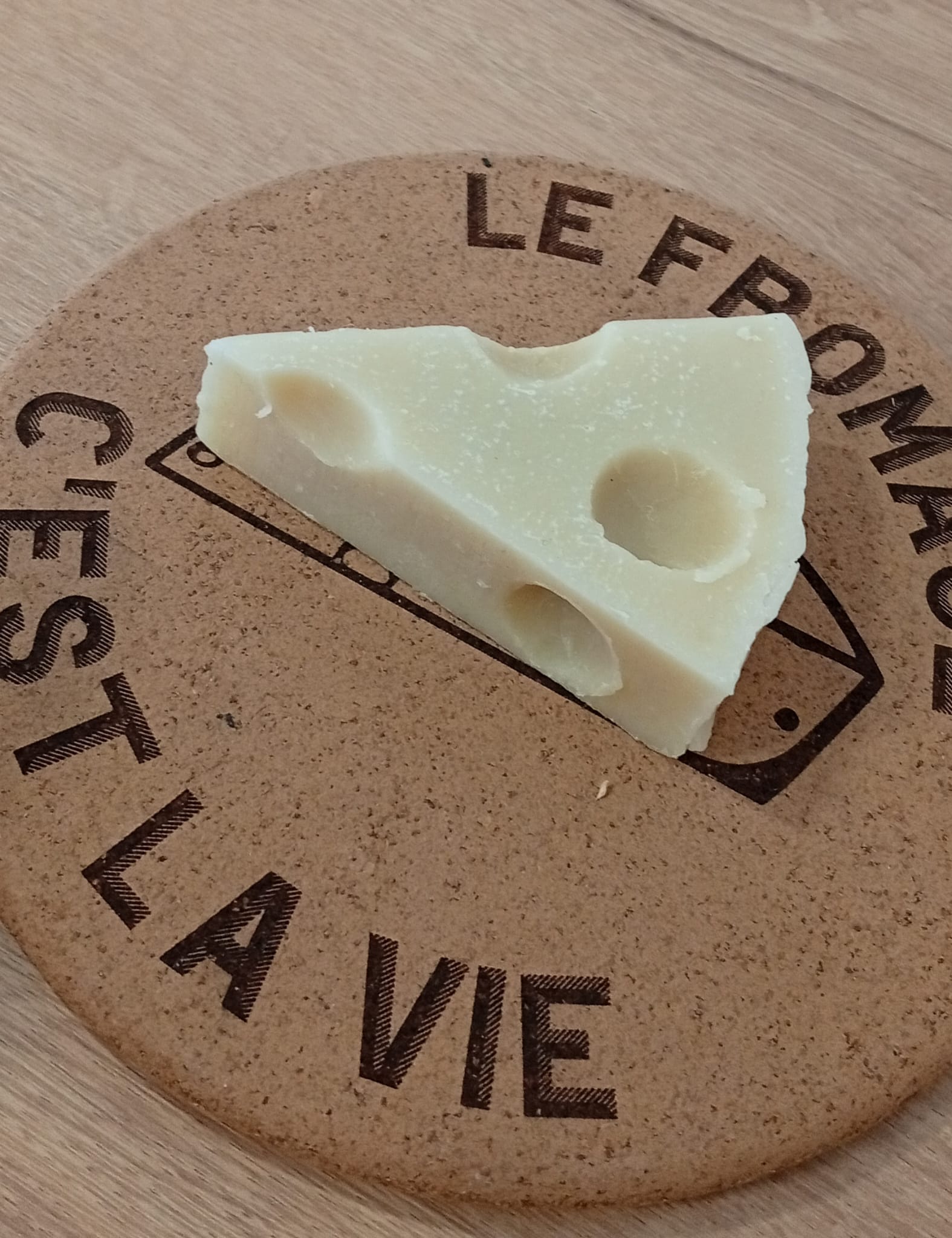 Savon décoratif en forme de gruyère, fabriqué artisanalement à la main — un trompe-l’œil gourmand et 100 % végétal.