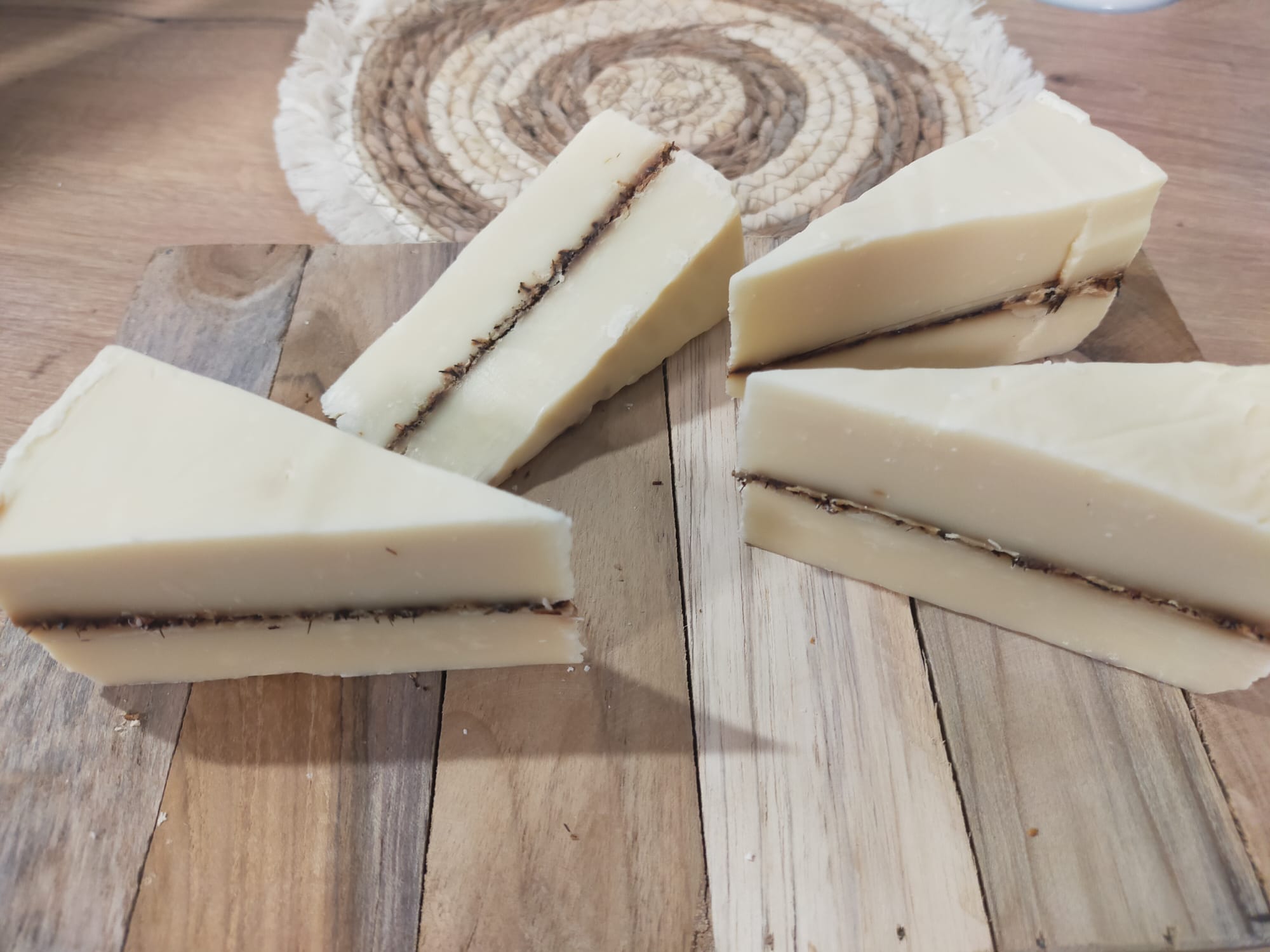 Savon fait à partir d’infusion de Rooibos, et du Rooibos pour faire la ligne si significative du morbier.