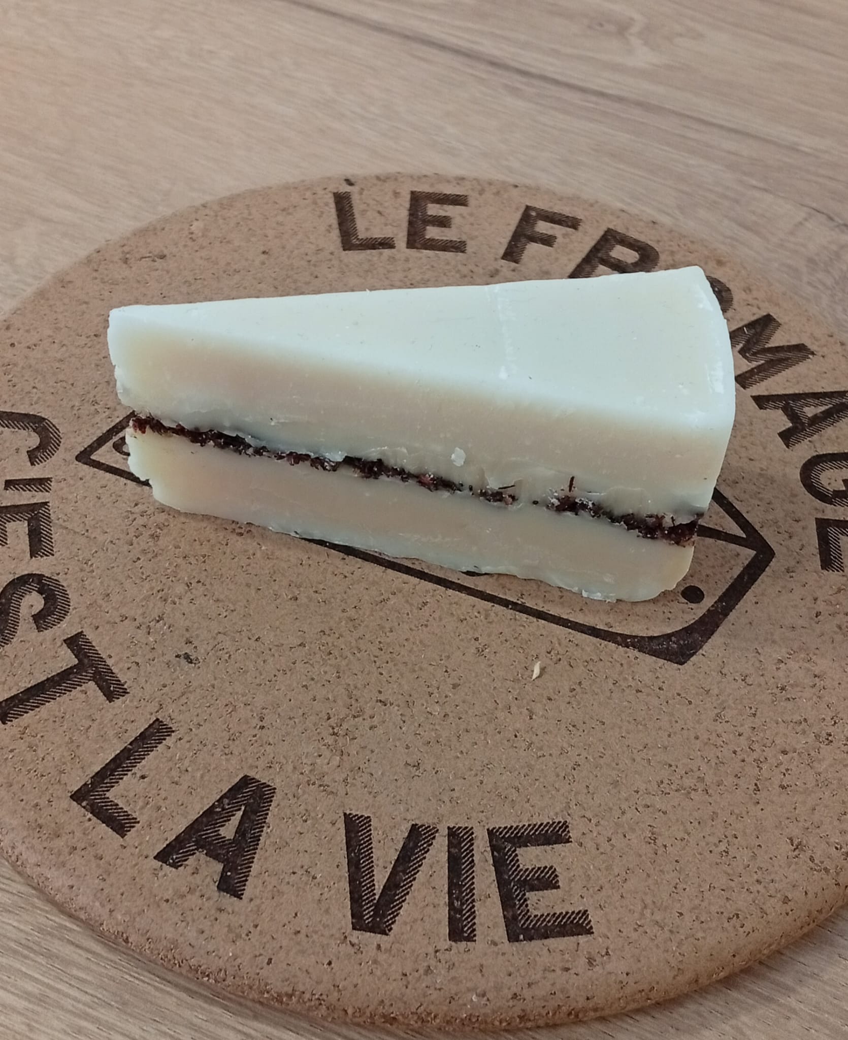 Savon décoratif en forme de Morbier, fait main et 100 % végétal. Un clin d’œil réaliste et original pour une déco pleine de caractère.