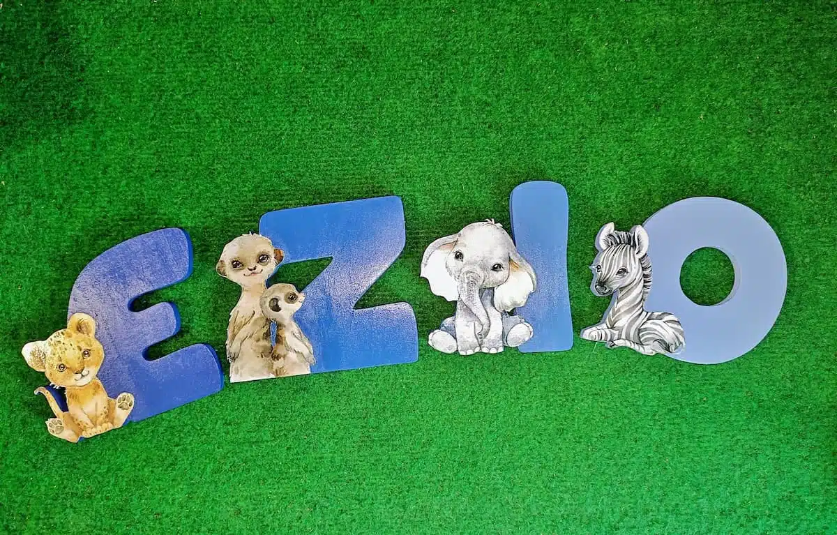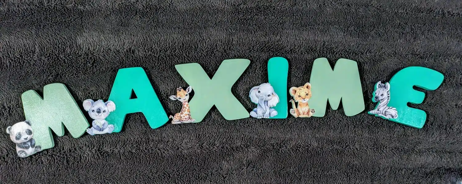 Lettres artisanales en bois pour composer le prénom de bébé avec les animaux safari