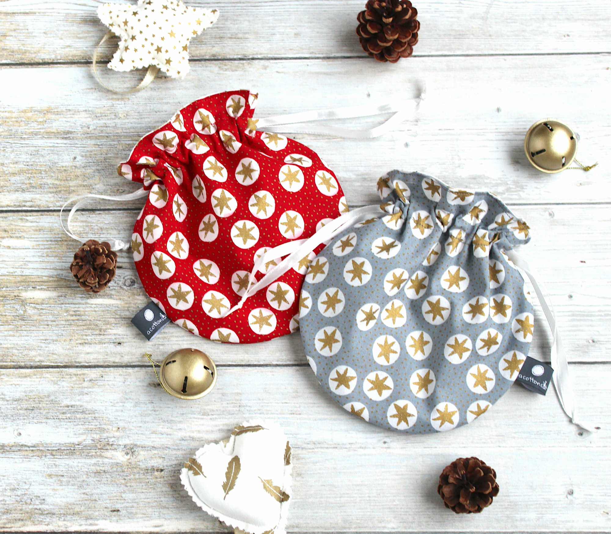 Lot de 2 pochons en tissu de Noël. Emballage cadeau idéal pour suspendre au sapin.