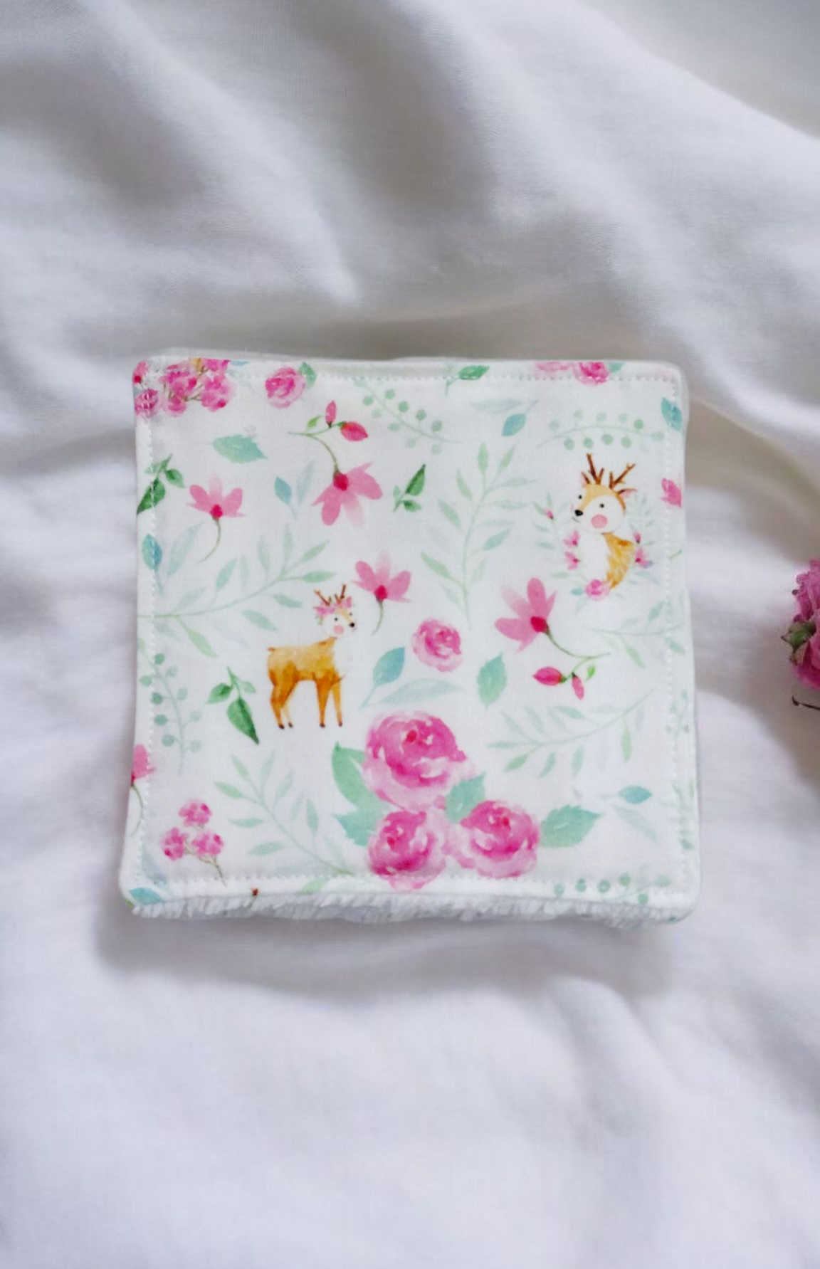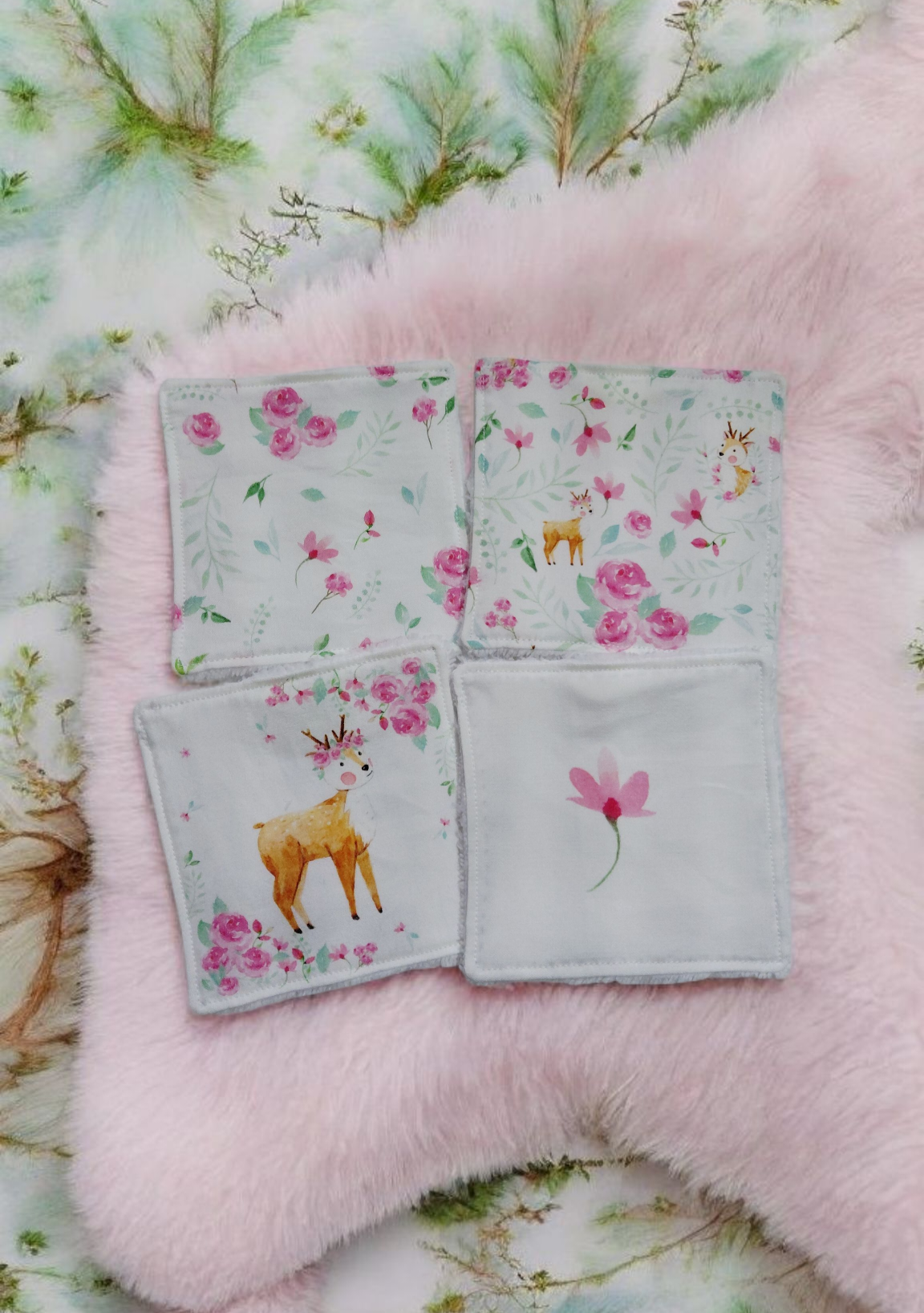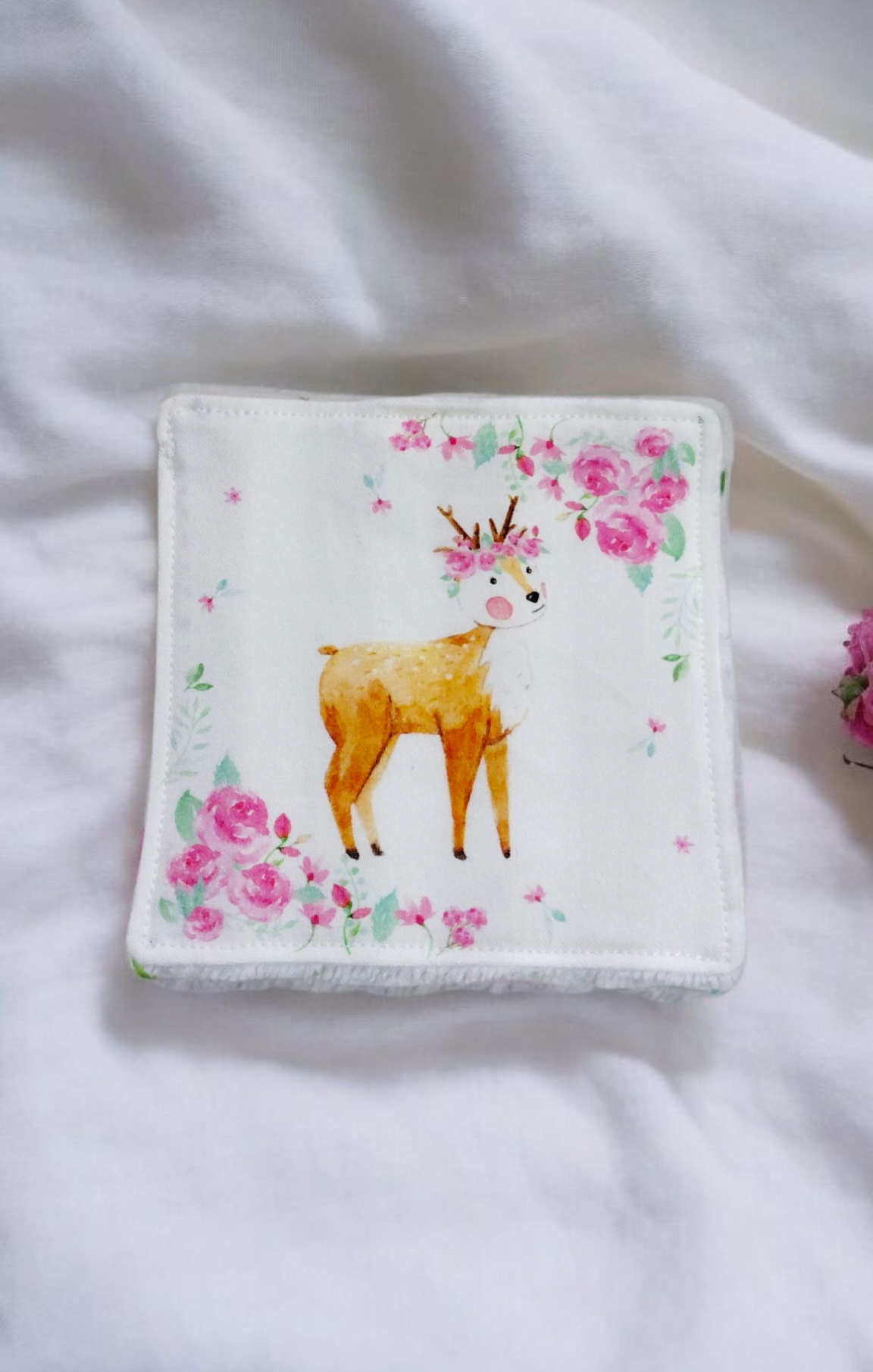Apportez une touche de nature à votre routine beauté avec ce lot de 4 lingettes lavables motif cerf aquarelle, confectionné à la main avec soin.