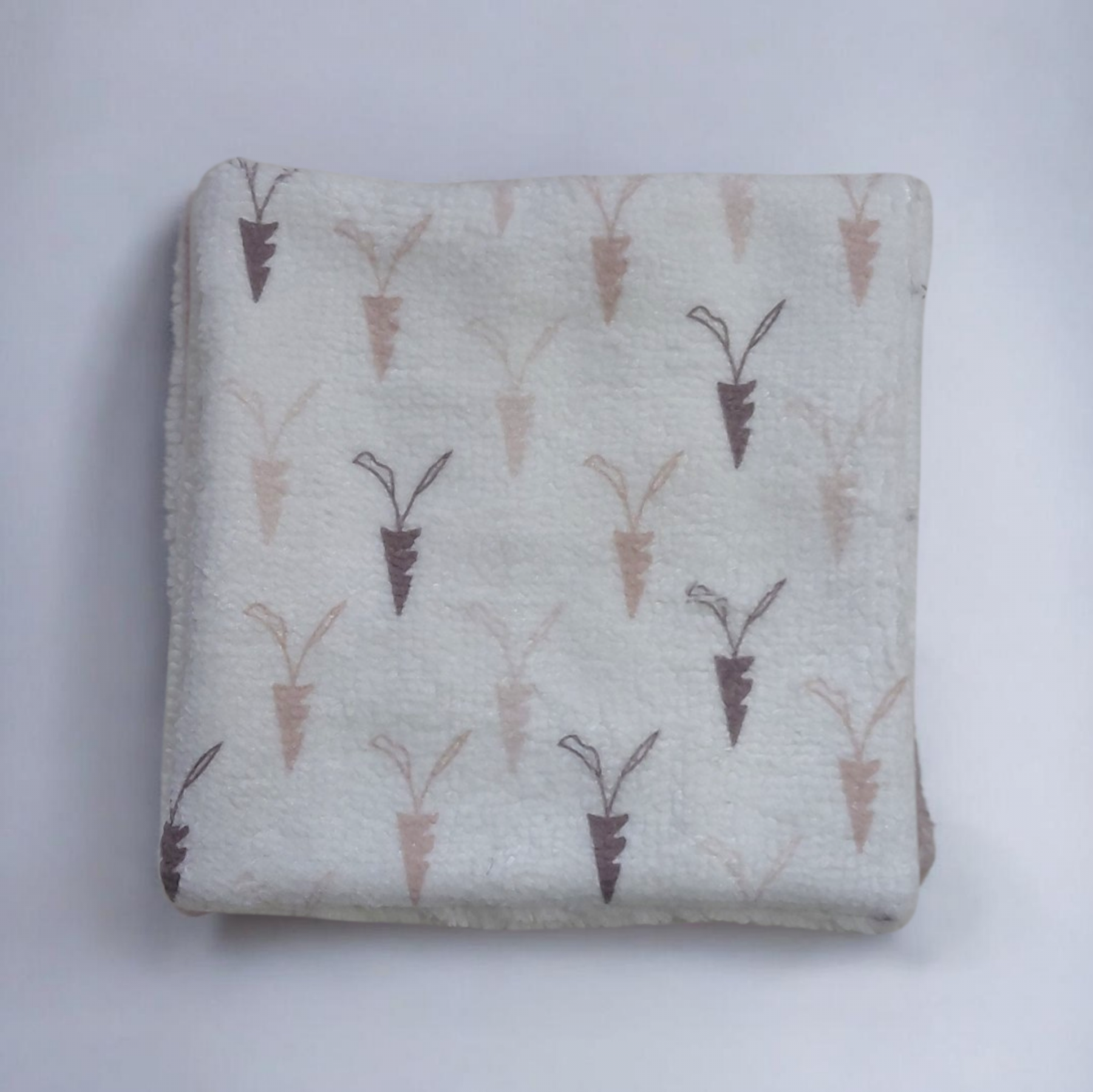 🌿 Une face en éponge imprimée ultra douce, aux motifs délicats (lapin, étoiles, carottes) dans des tons nude et apaisants