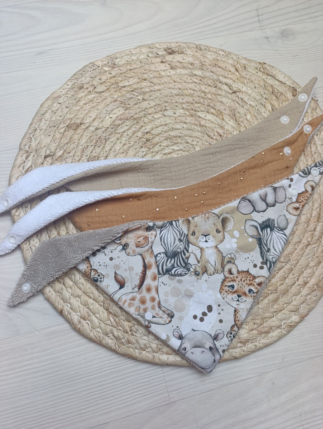 Ensemble cadeau composé d’un lot de 3 bavoirs bandana ( motifs savane, beige , camel) et un lot de 7 lingettes lavables (9×9 cm).