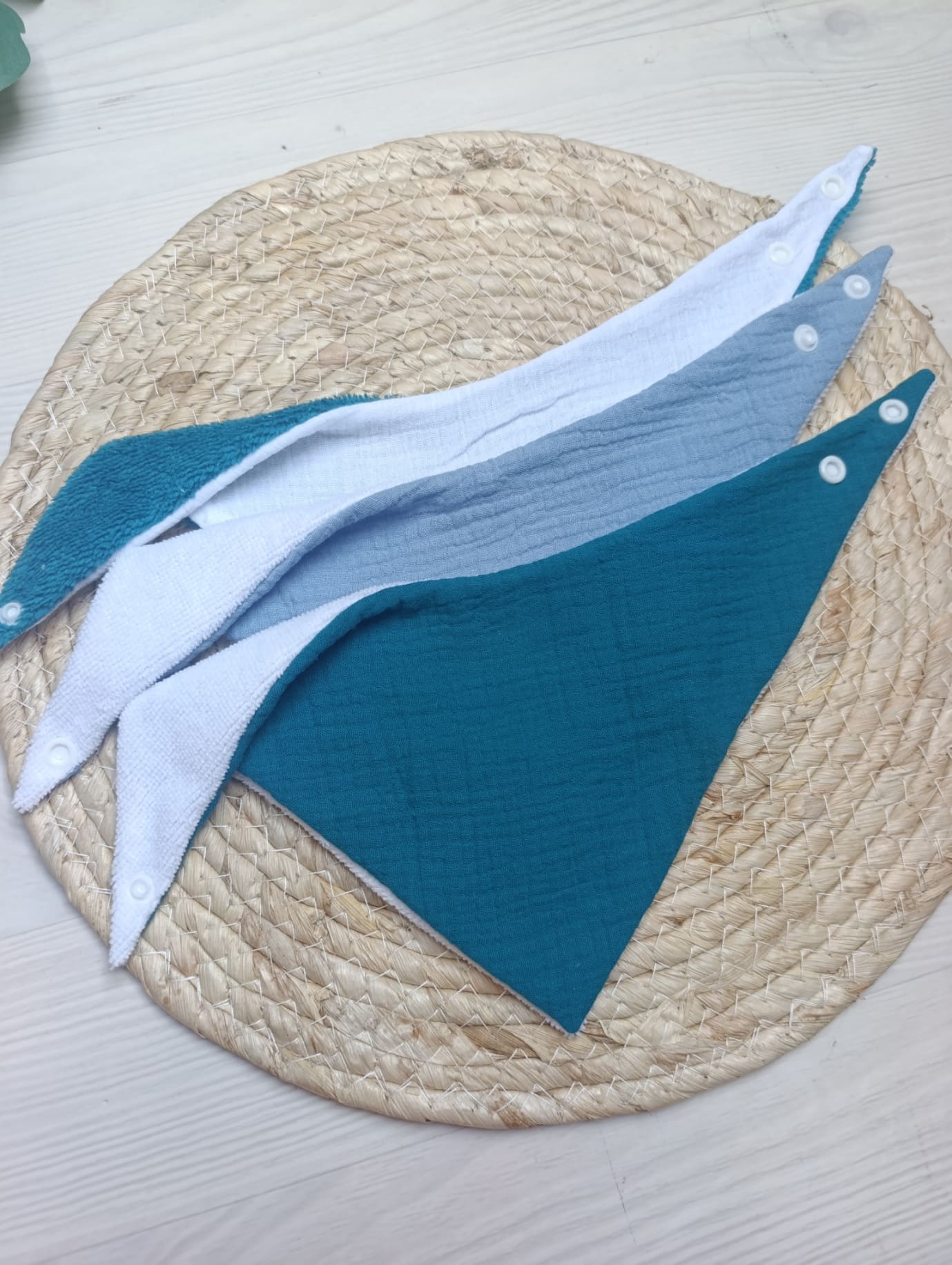 Ensemble cadeau composé d’un lot de 3 bavoirs bandana ( motifs renard, bleu ) et un lot de 7 lingettes lavables (9×9 cm).