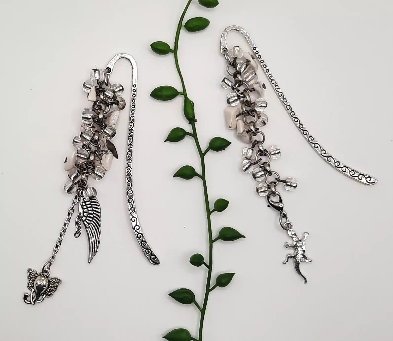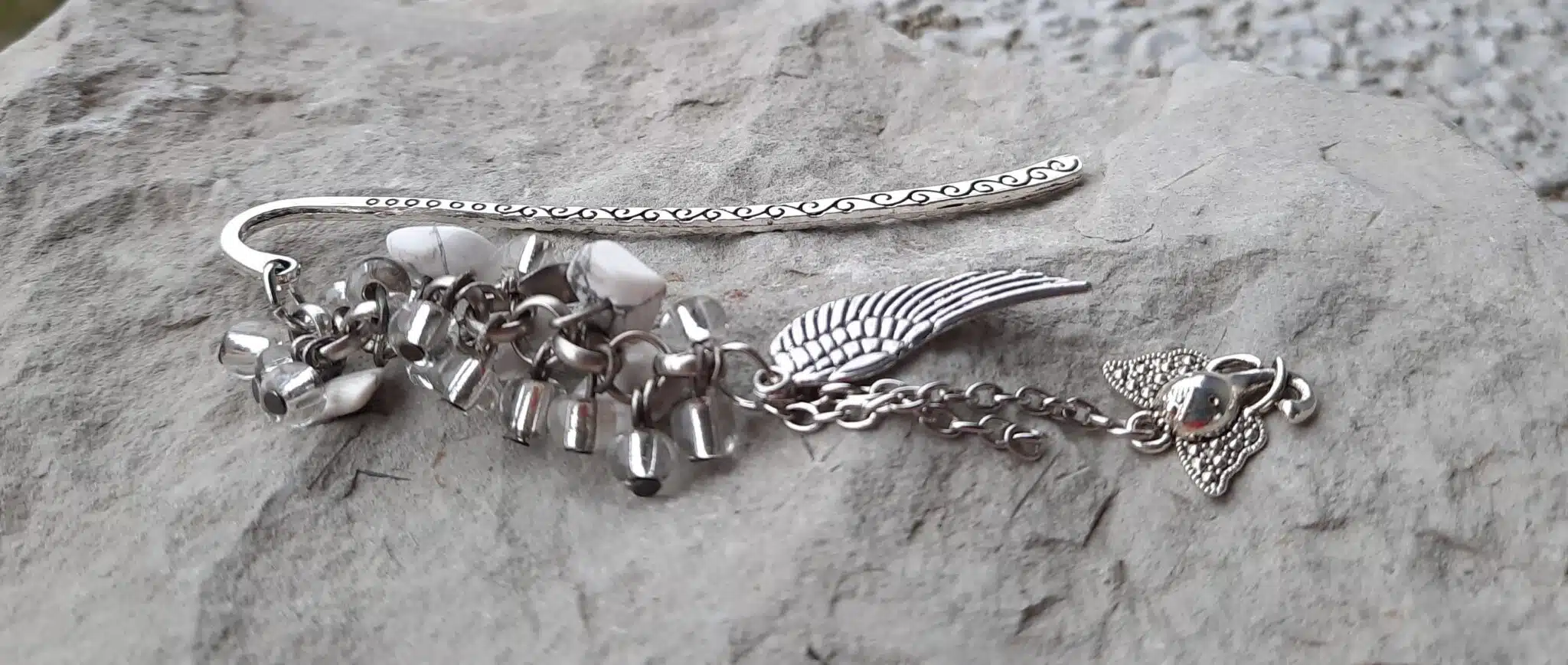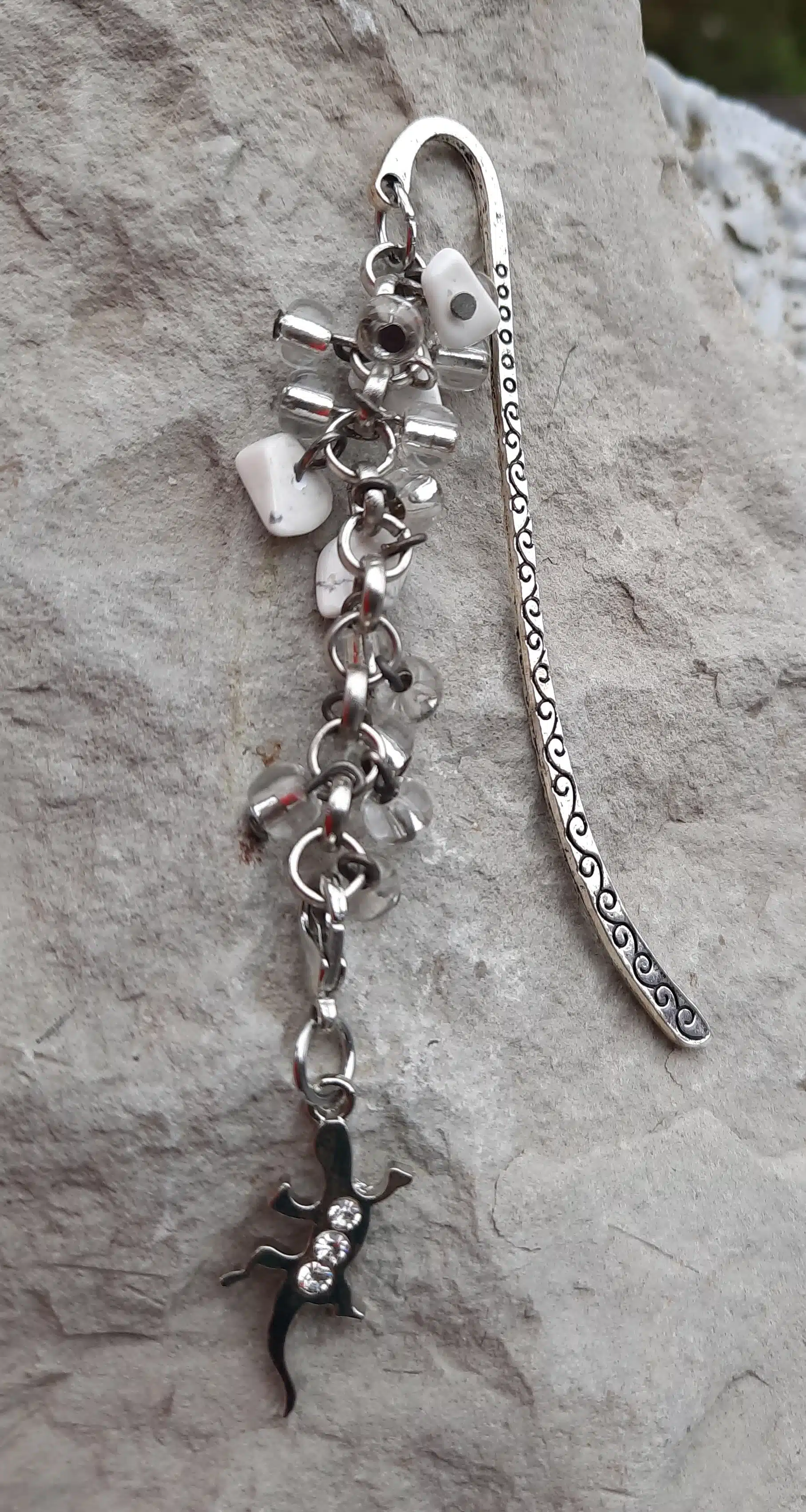 Ces connecteurs ciselés marque page, de couleur argent sont agrémentés d’une chaîne à gros maillons auxquels j’ai attaché des perles de rocailles transparentes, des perles chips crystal Howlite et des breloques. Leur longueur est de 10 cm.