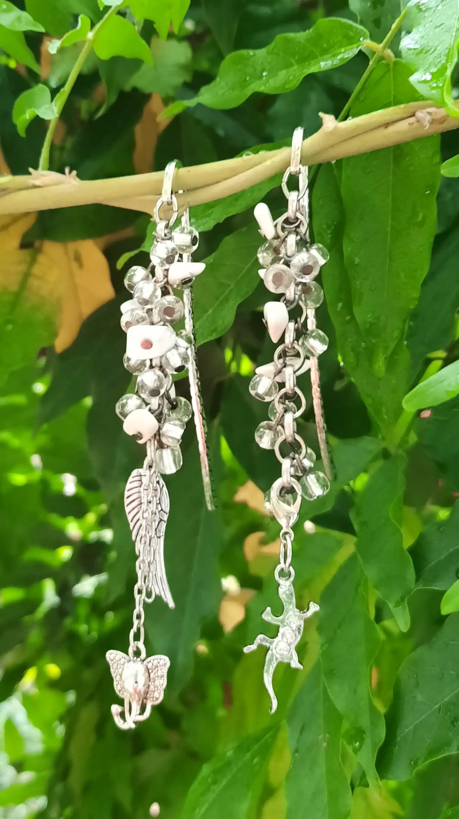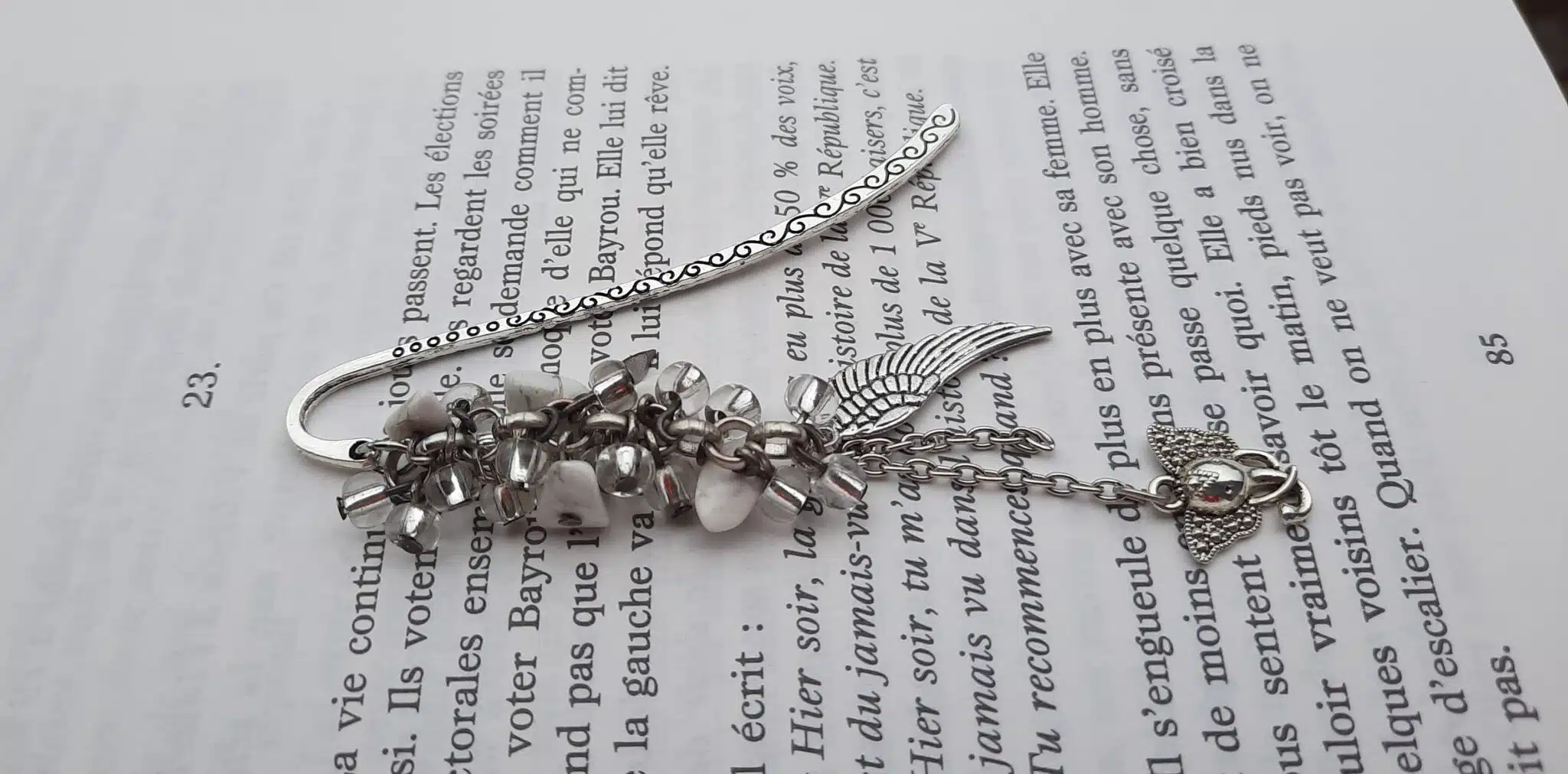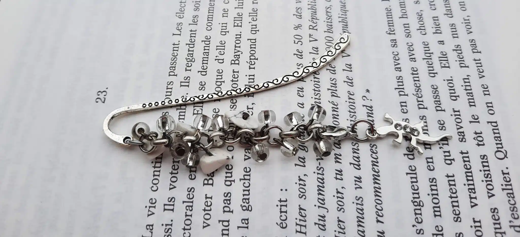 Ces connecteurs ciselés marque page, de couleur argent sont agrémentés d’une chaîne à gros maillons auxquels j’ai attaché des perles de rocailles transparentes, des perles chips crystal Howlite et des breloques. Leur longueur est de 10 cm.