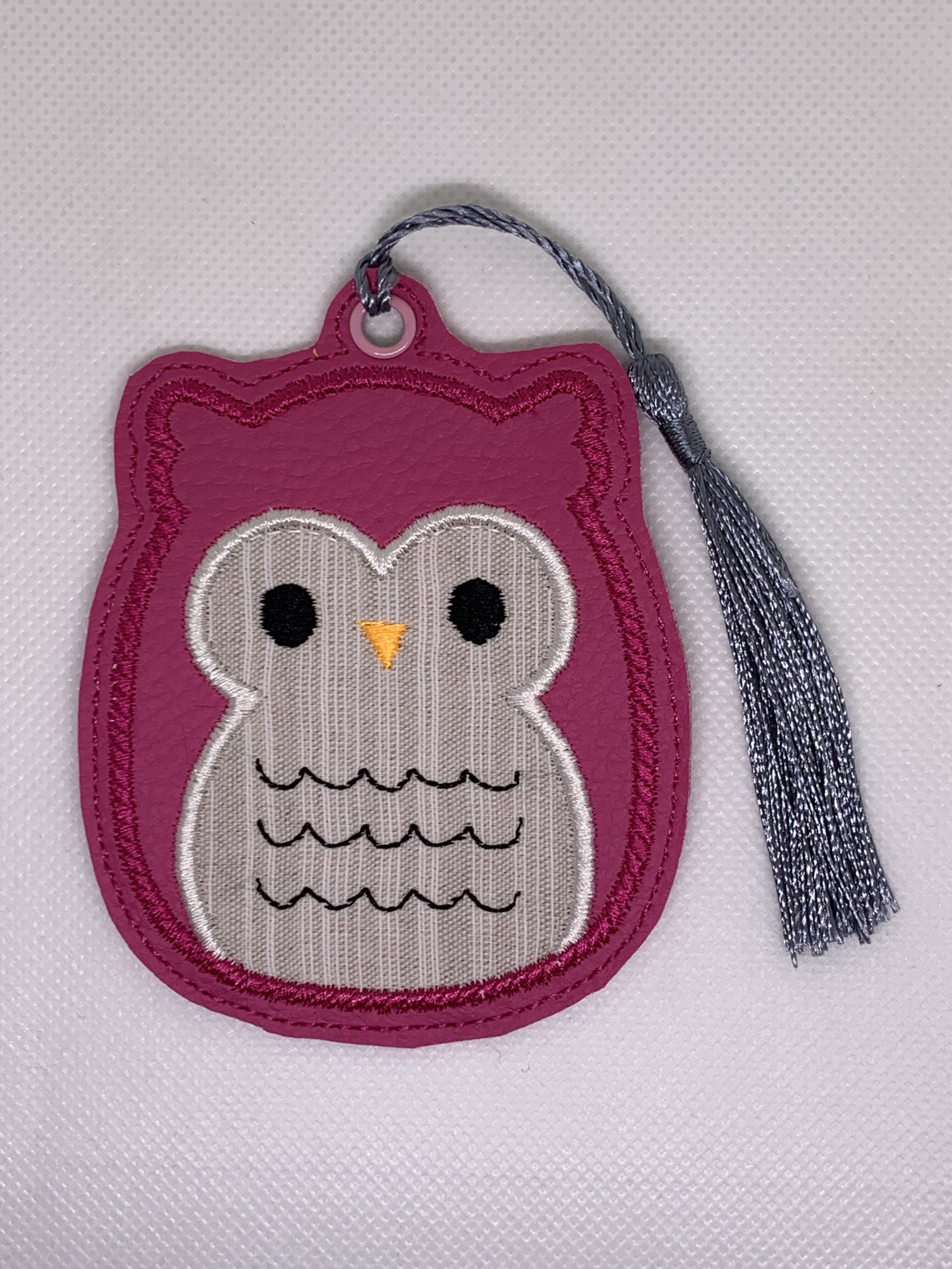 Marque pages chouette brodé sur simili cuir fuchsia.