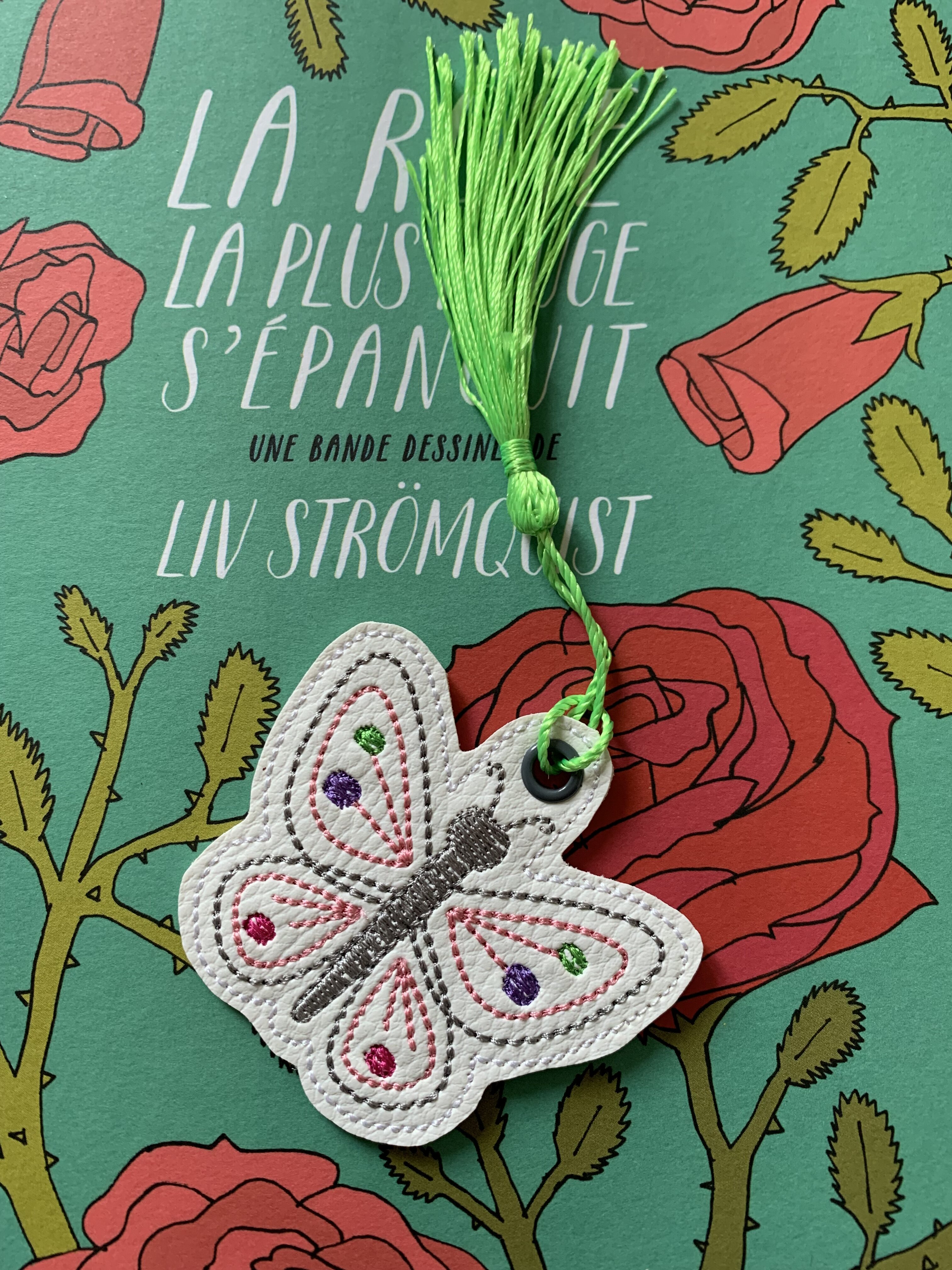 Marque pages papillon brodé sur simili cuir blanc.