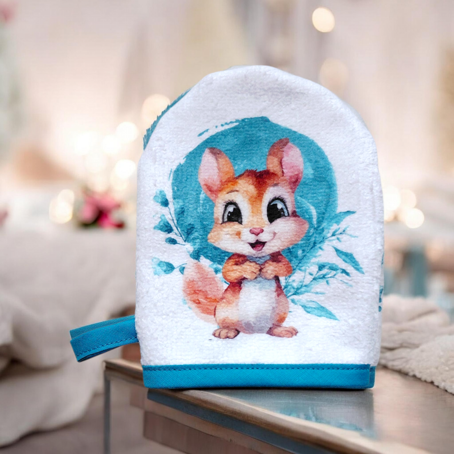 d’une double face en éponge ultra douce imprimé en France, aux motifs écureuils aquarelle