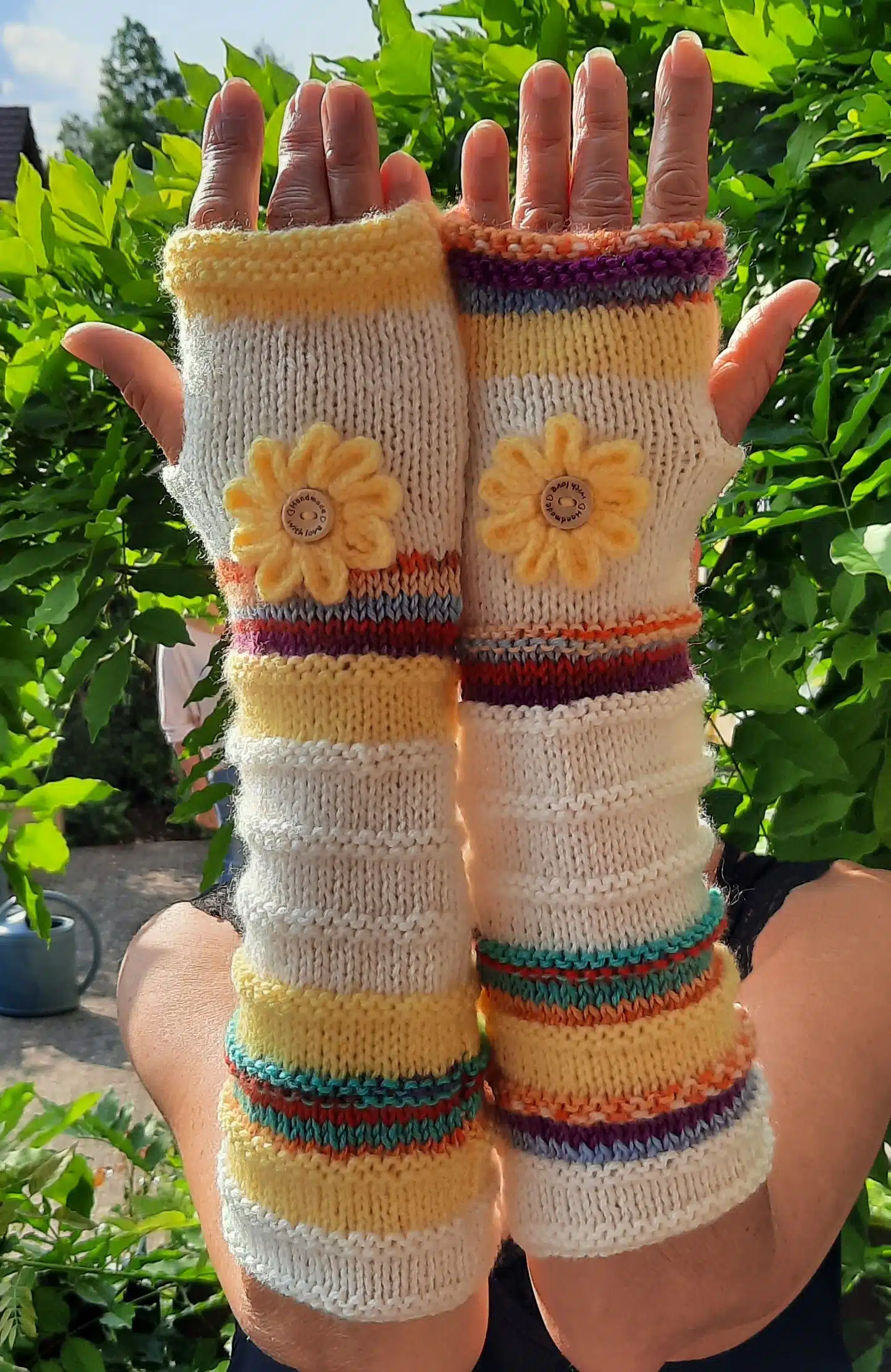 Ces mitaines, originales et stylées, sont agrémentées de jolies fleurs crochetées dont les boutons sont choisis avec grand soin pour une parfaite harmonie. Les bordures sont faites au tricot point mousse.