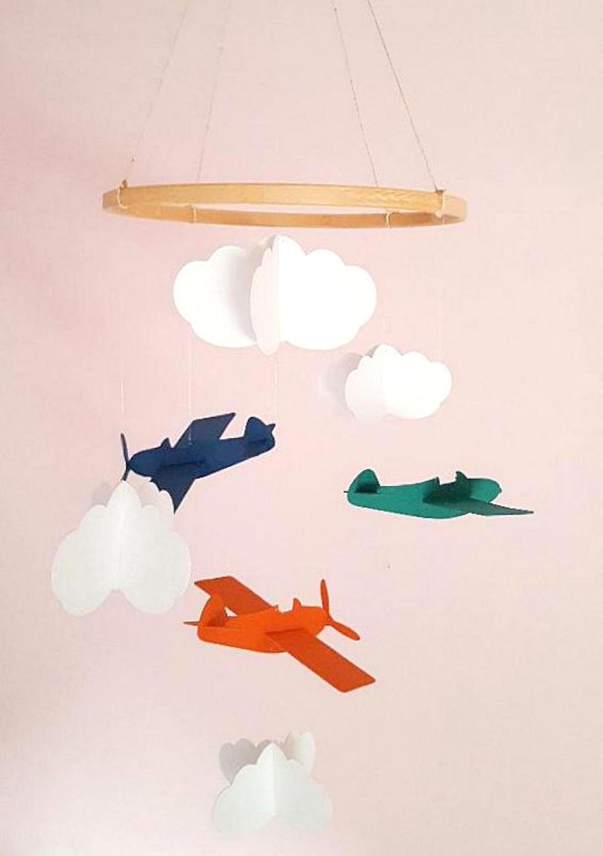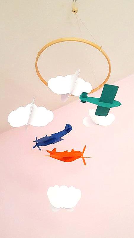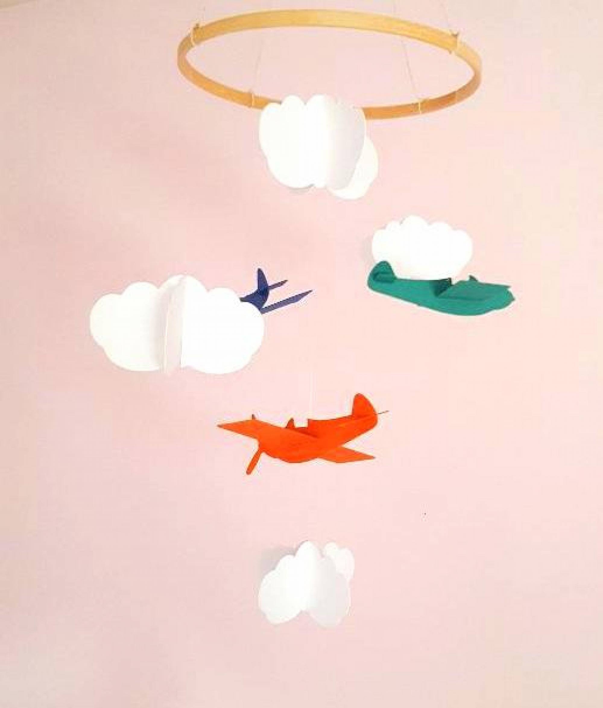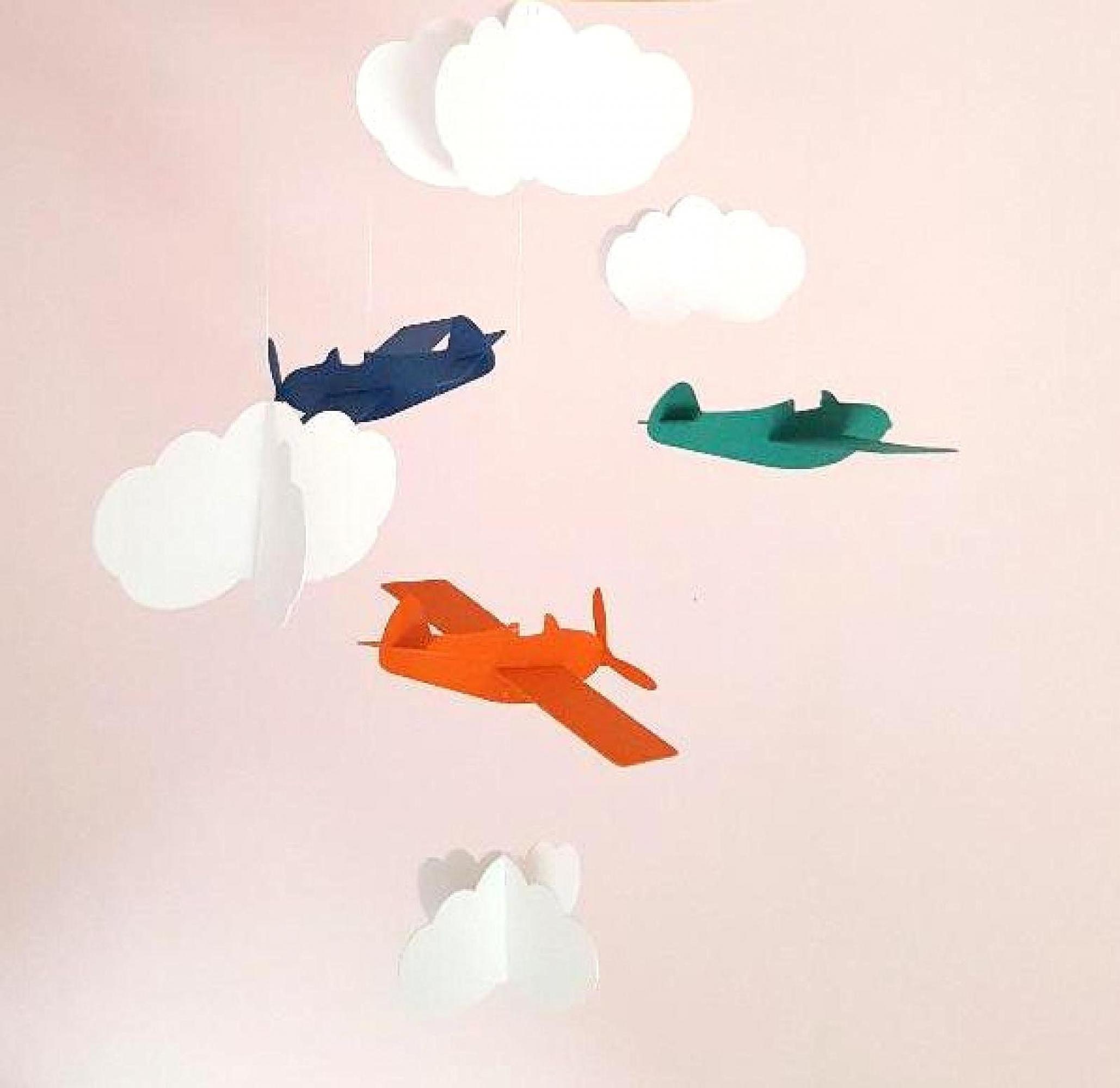 Fait à la main avec amour, ce mobile en papier recyclé est une création artisanale unique qui évoque la douceur du ciel. De jolis avions et des nuages blancs en papier 3D flottent au bout de fils fins, créant une scène aérienne légère et apaisante. Parfait pour apaiser et stimuler visuellement votre tout-petit dès les premiers mois.