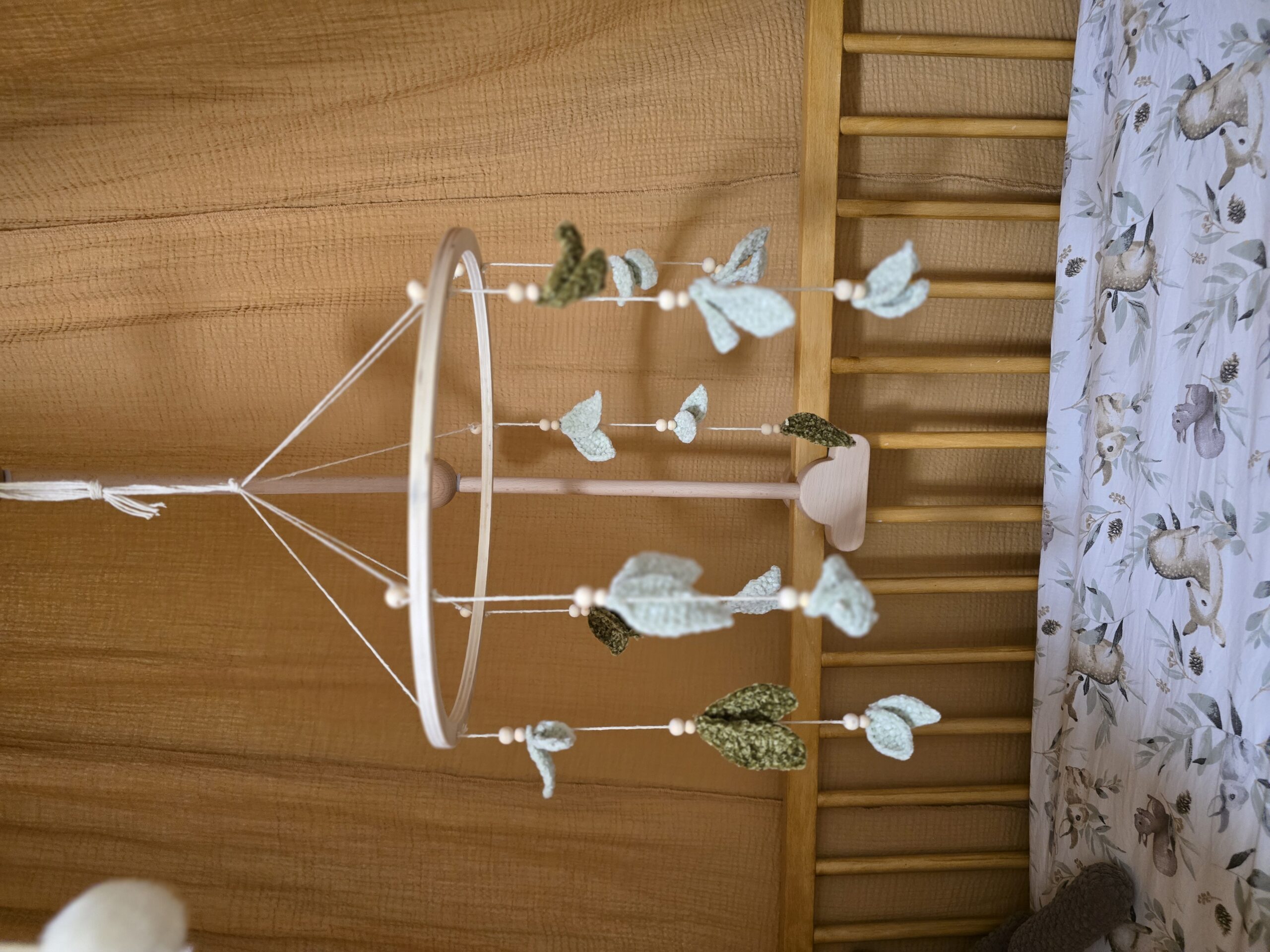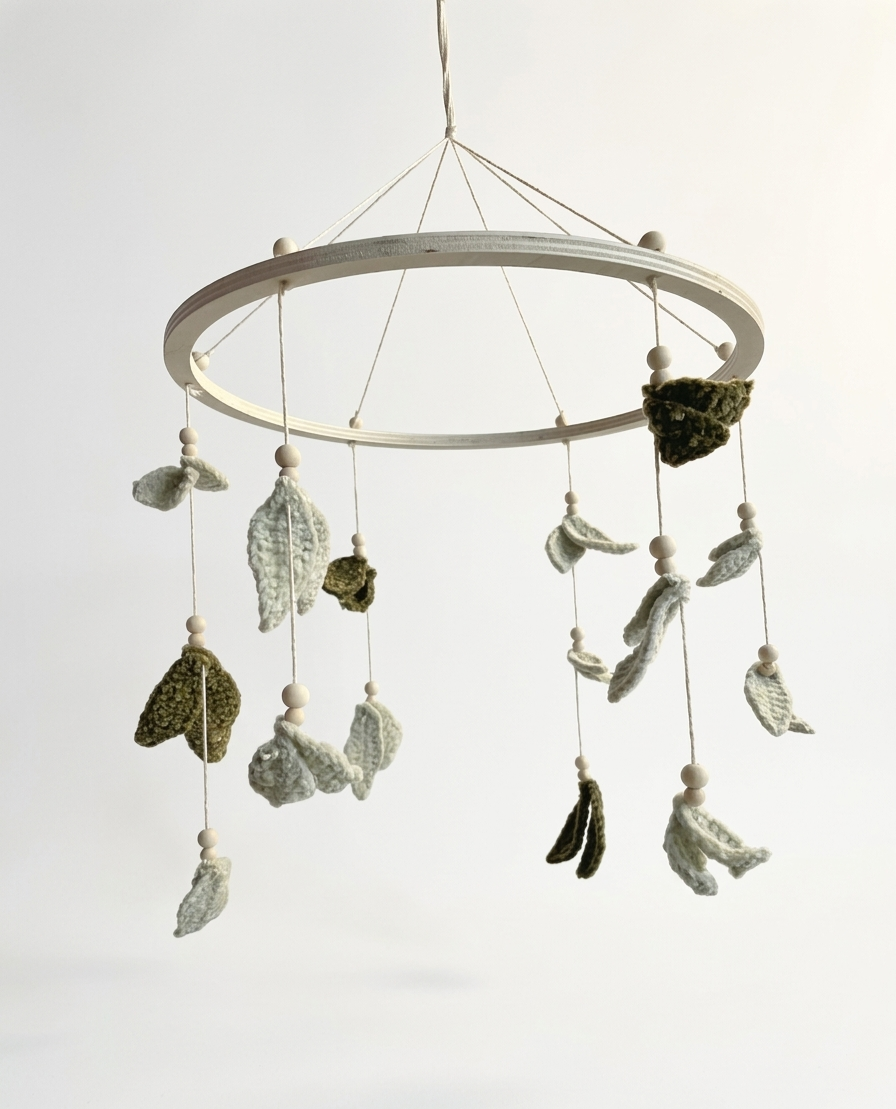 Inspiré par la nature, ce mobile se compose de délicates feuilles crochetées dans des nuances de vert apaisantes, suspendues à un cercle en bois naturel. Chaque pièce est réalisée avec soin, offrant une texture unique et chaleureuse que seul le fait-main peut apporter.