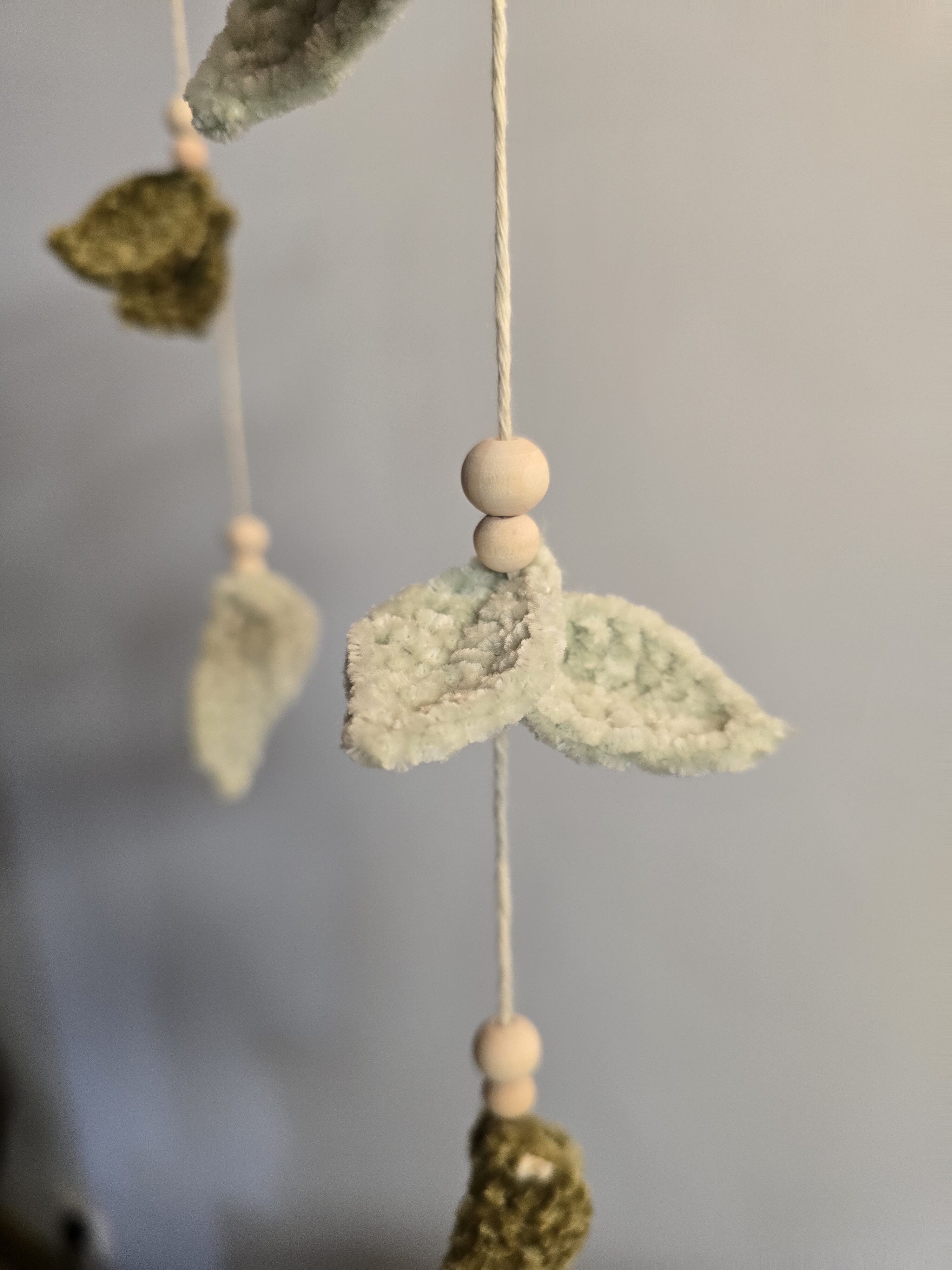 Chaque feuille, dans ses nuances de vert tendre et kaki, est suspendue délicatement, créant un mouvement hypnotique et rassurant qui captivera le regard de votre enfant. Inspiré de la nature, ce mobile apporte une touche de poésie, de douceur et d’élégance à la chambre de bébé.