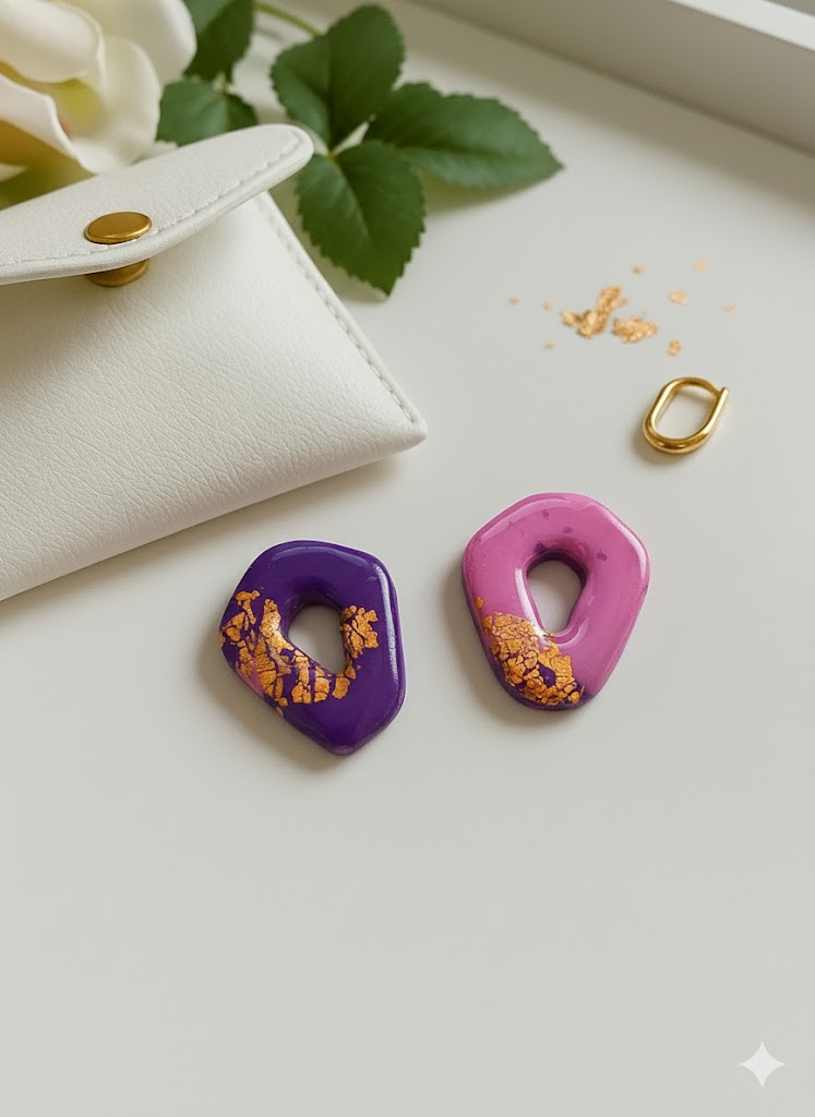 Façonnées à la main avec soin en argile polymère, ces pièces arborent un riche violet profond et vibrant, rappelant la couleur envoûtante de l’améthyste. Le secret de leur éclat réside dans l’incrustation délicate de feuille d’or (ou feuille de cuivre) qui apporte une touche sophistiquée et lumineuse.